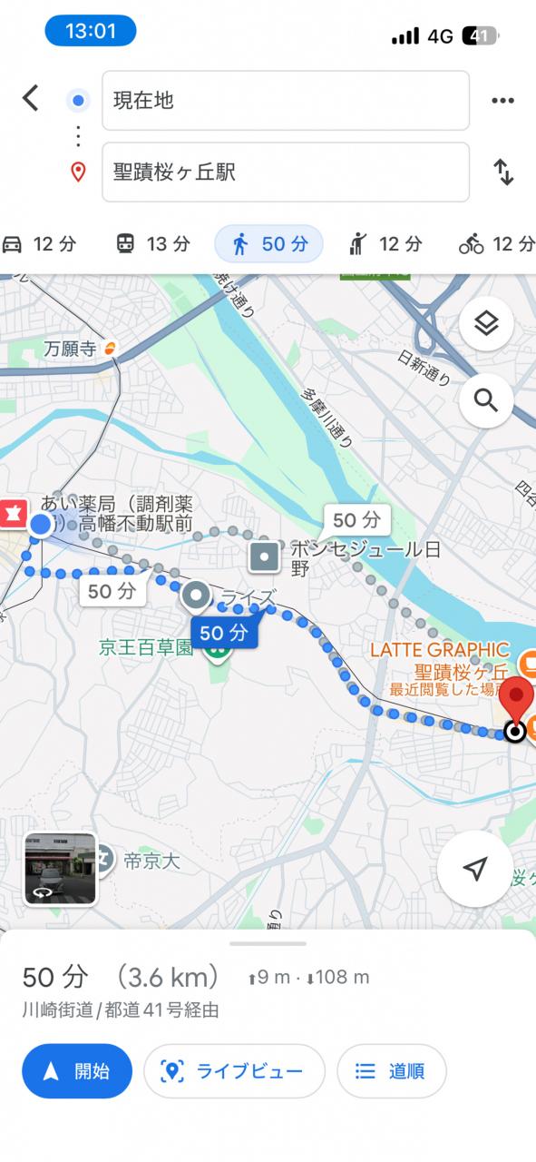 食べた後は歩きます♪高幡不動駅まで50分歩きます♪約5分程歩き、聖蹟桜ヶ丘駅方面を振り返っています。