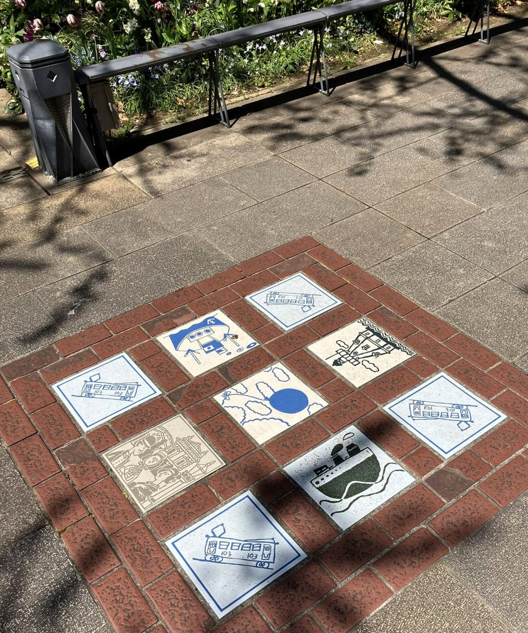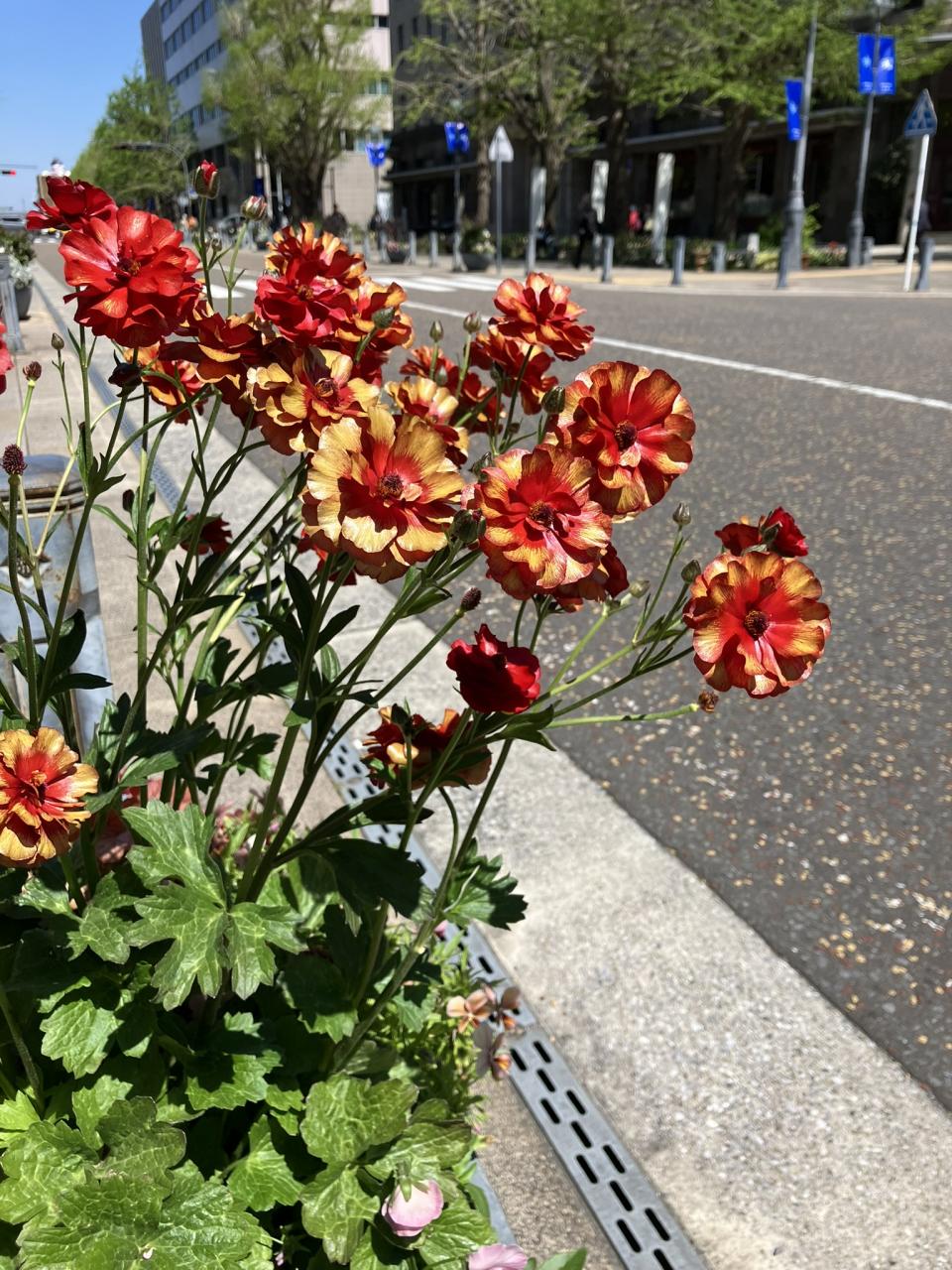 日本大通りの広い歩道には、プランター植えの花と