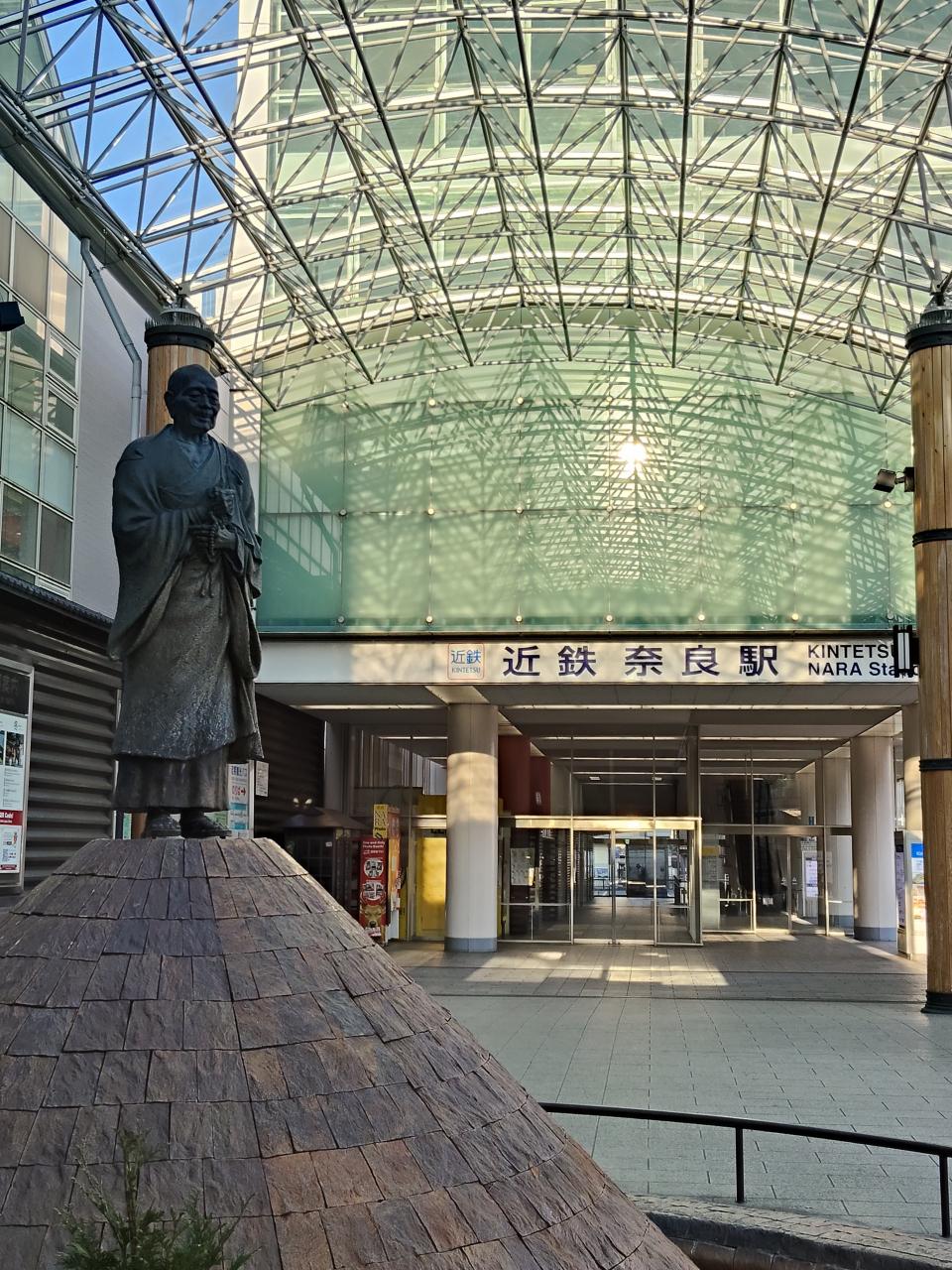 2日目、午前6時半、ホテル出発し吉野へ。歩いて15分弱で近鉄奈良駅着。駅はこのビルの地下です。駅前に立つ像は行基菩薩。飛鳥・奈良時代のお坊さん。
