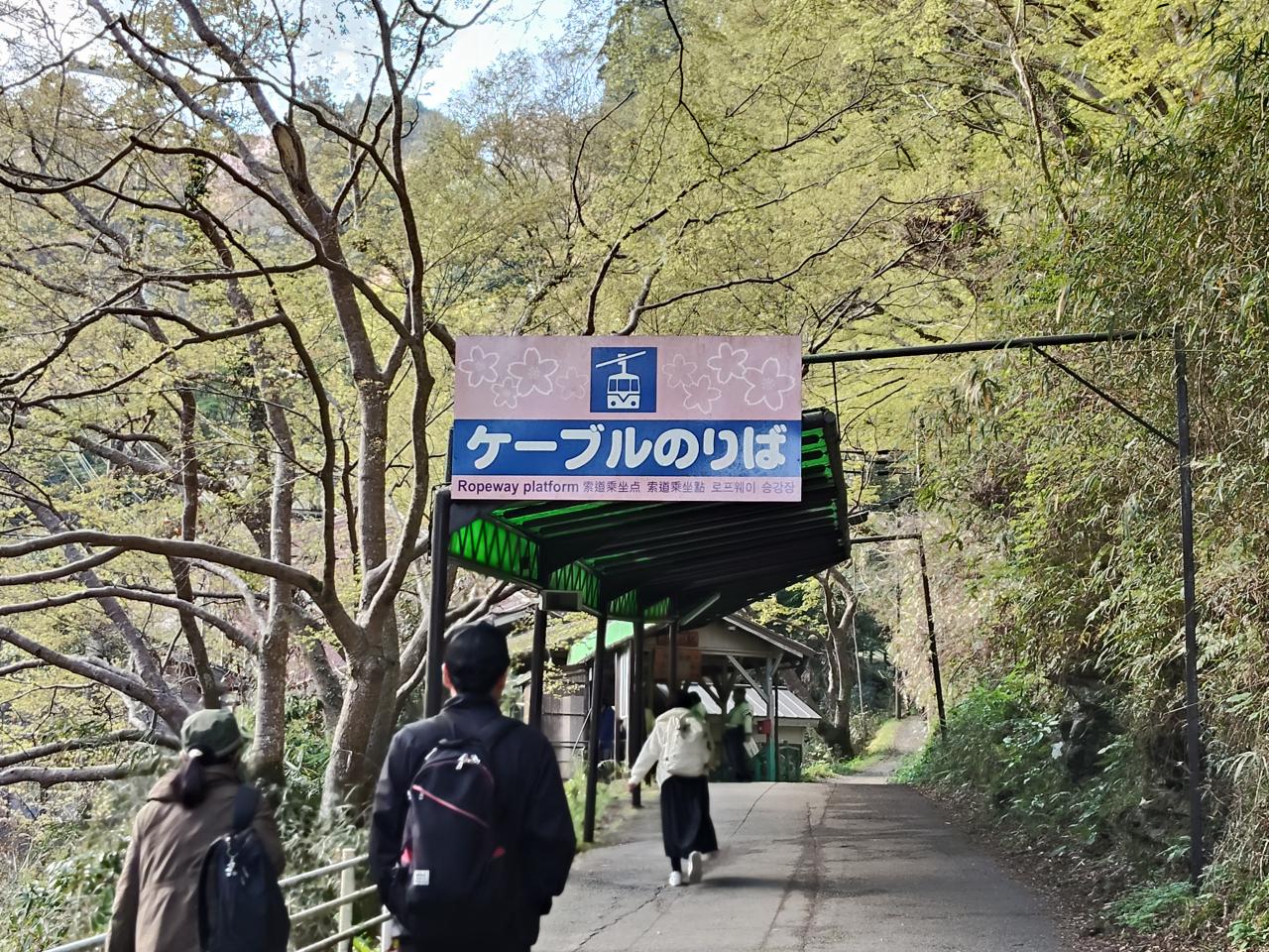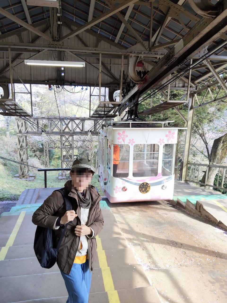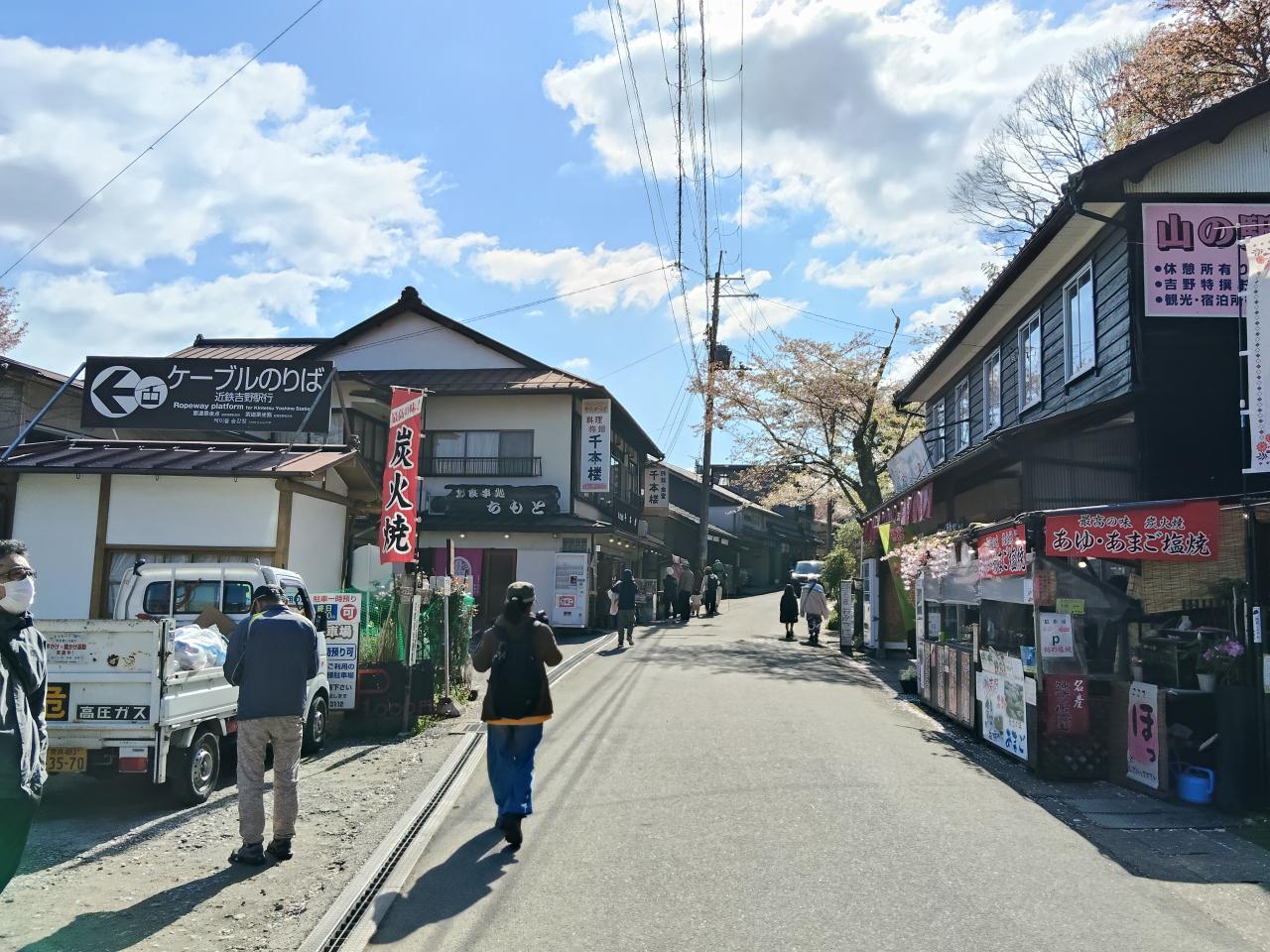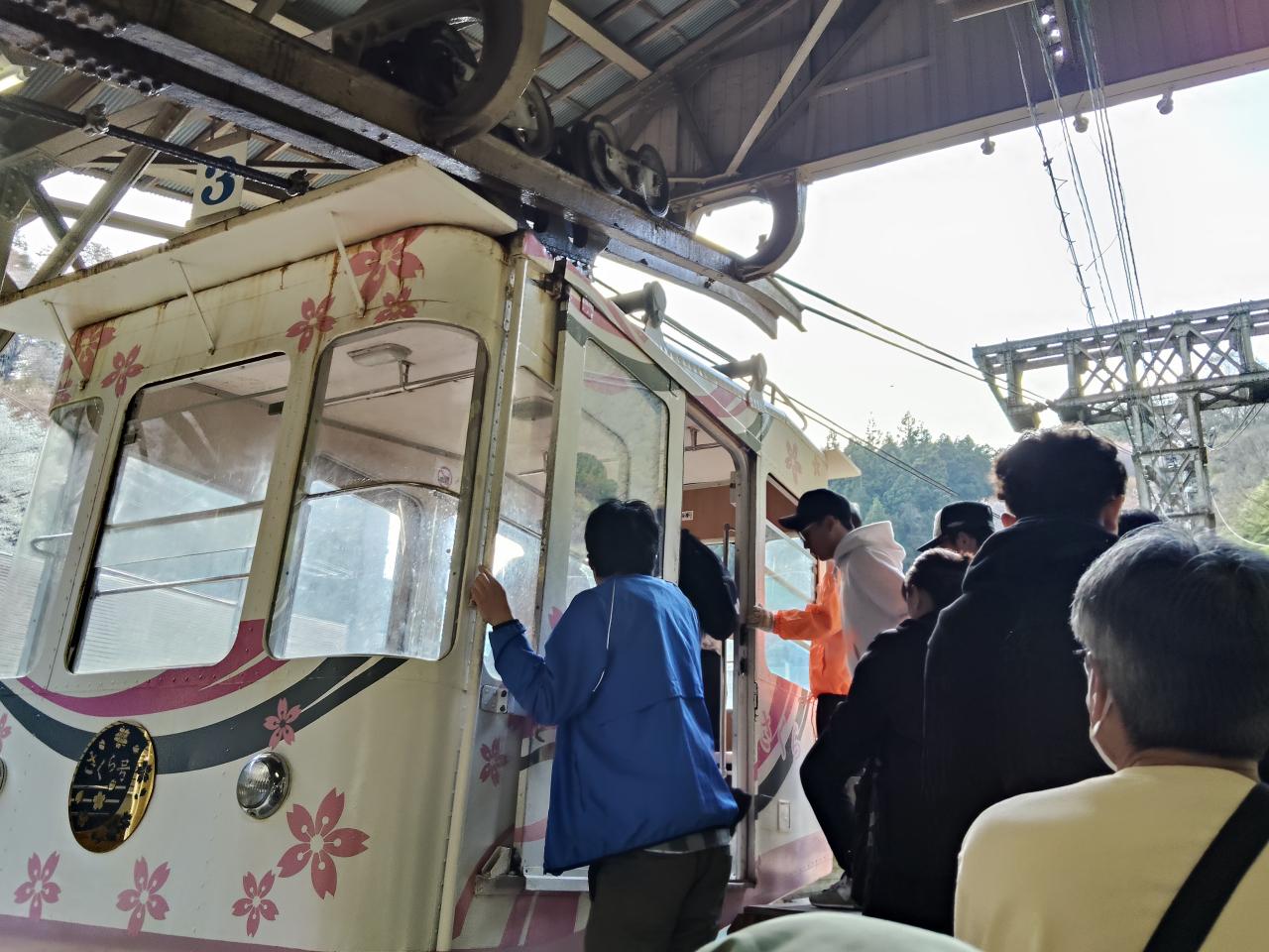 近鉄を2度乗り換えて、8時半吉野着。橿原神宮前駅から吉野への電車は通勤ラッシュ並みの混雑でした。駅前のバス乗り場は既に長蛇の列。バスで奥千本まで行き、そこから下るのは楽でいいが、乗車まで何時間待ちになるか、見当がつかない。我々は歩くことをさほど苦にしないので、ケーブルカー乗り場へ。
