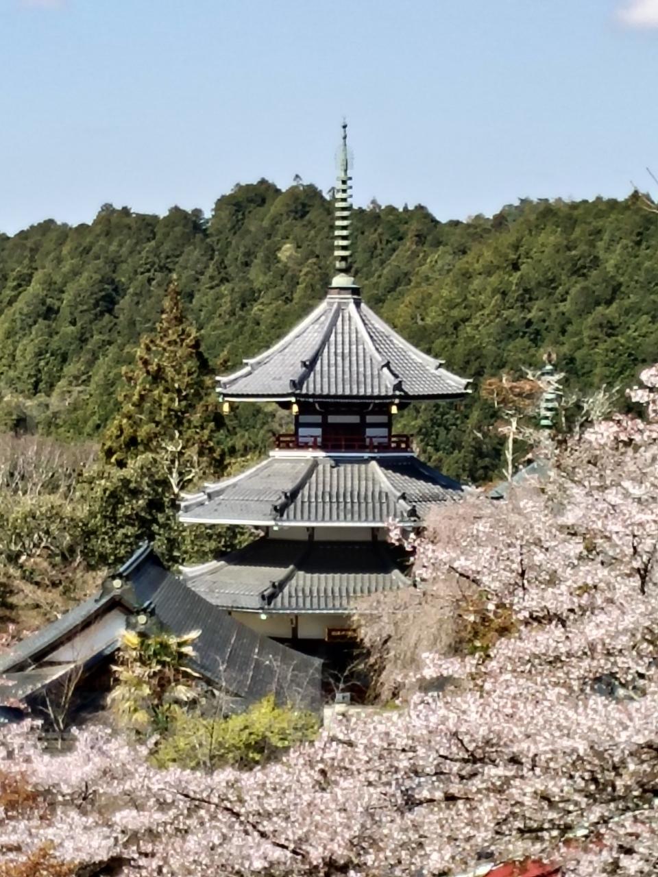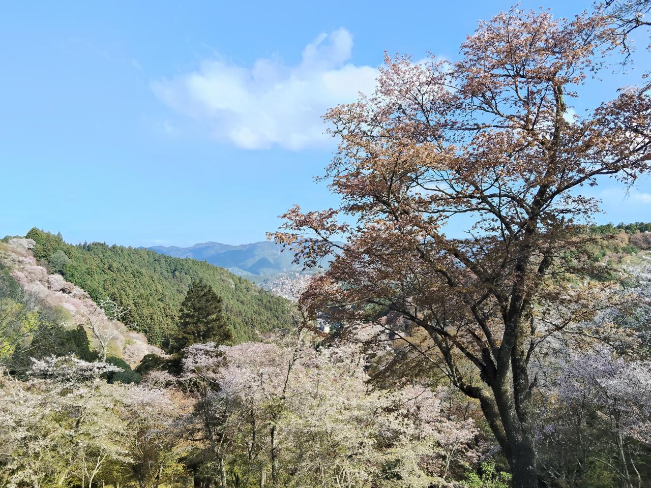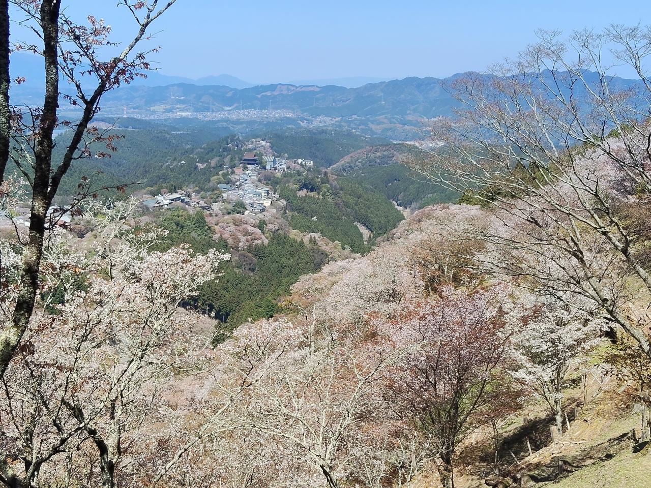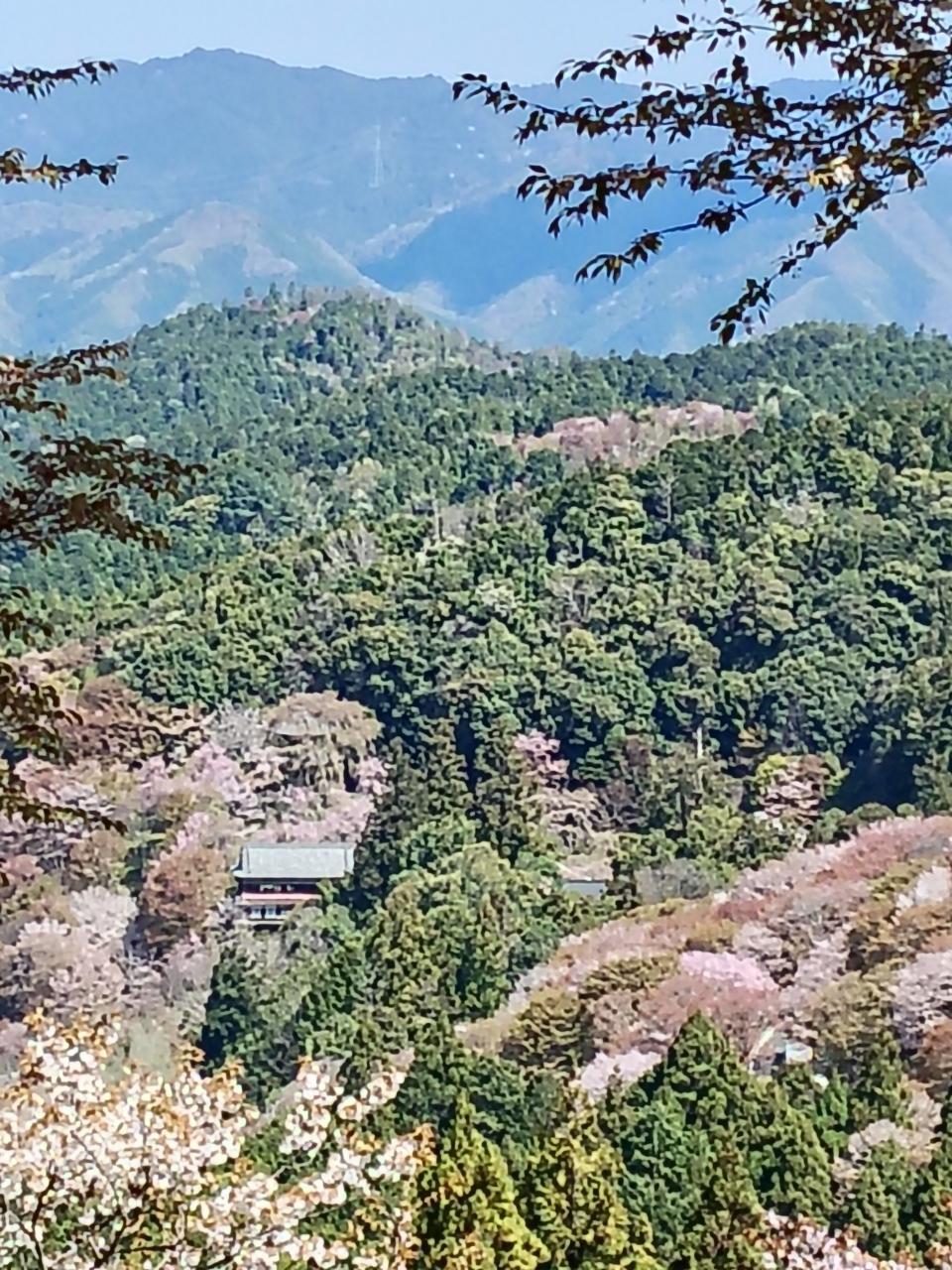 遥か下に桜にか囲まれた金峯山寺蔵王堂が見える。ずいぶん登ってきました。
