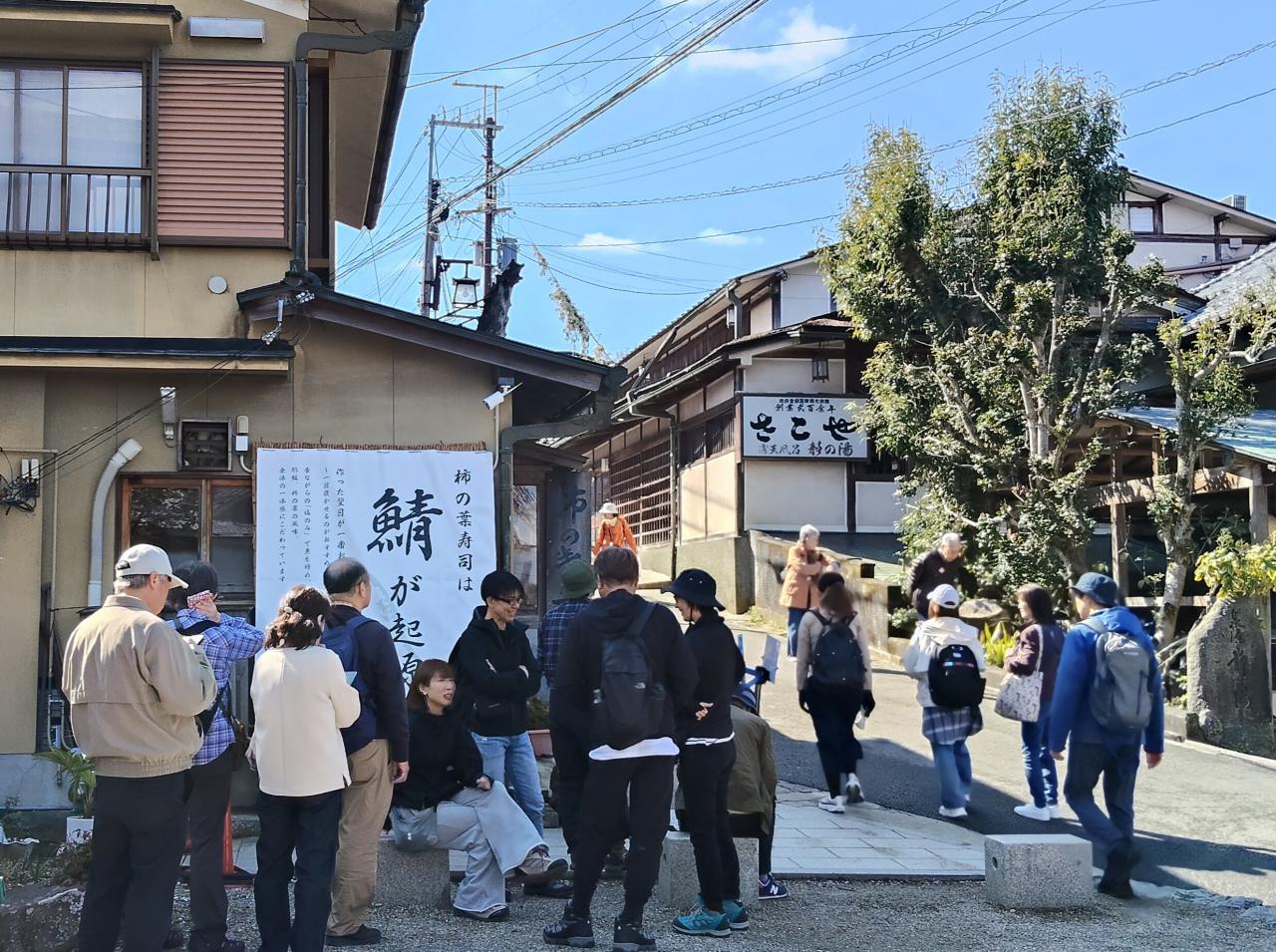 吉野名物の“柿の葉寿司”を買うために並ぶ人々。