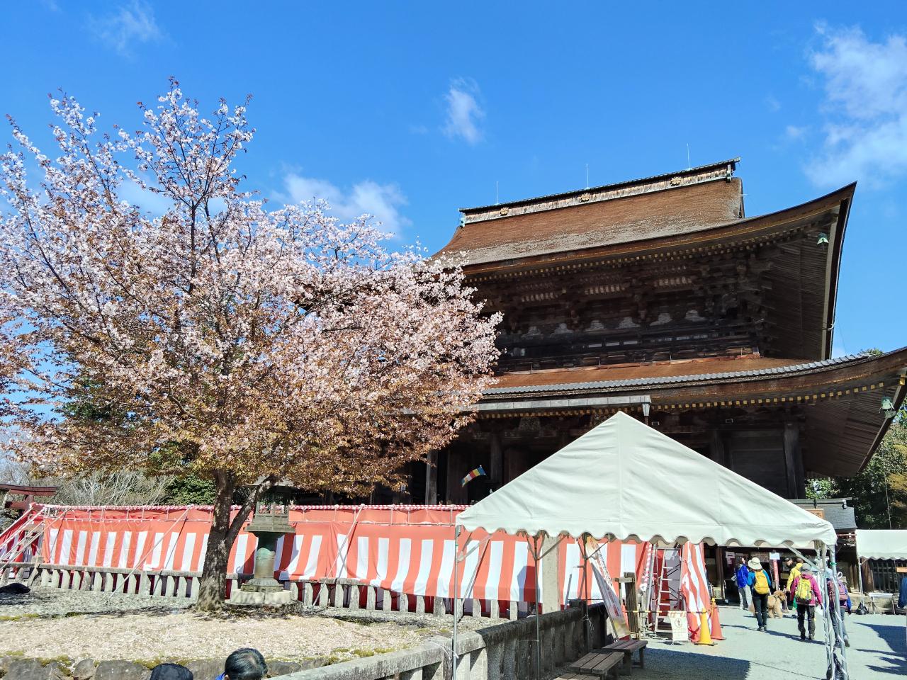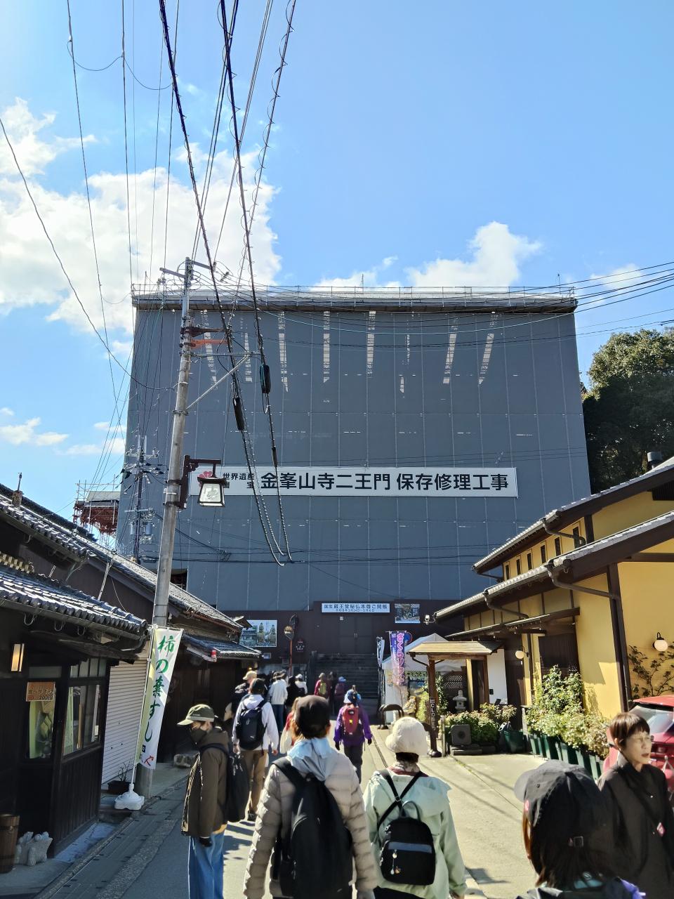 正面に見えるのは金峯山寺の仁王門(国宝)。あいにく修理中で全体を覆われている。