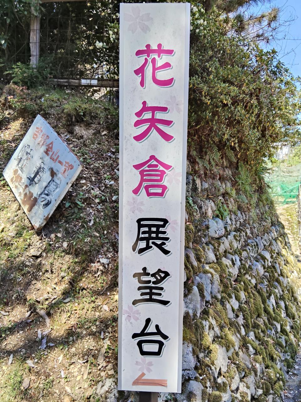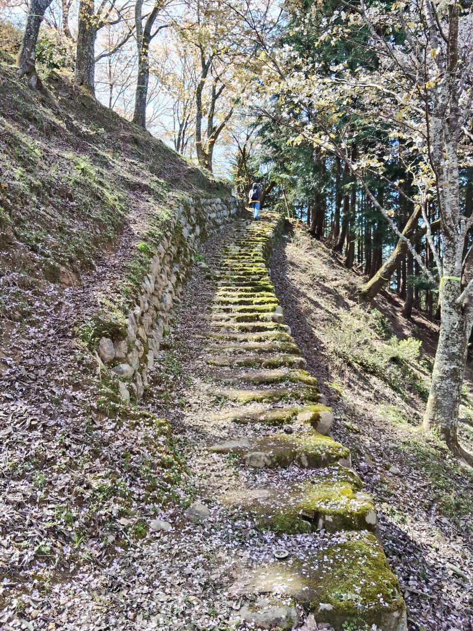 吉野駅から奥千本まで、基本的に舗装道路ですが、脇道の展望台や休憩所に行く道はこんな感じの登山道みたいなところもあります。花びらがたくさん落ちている。