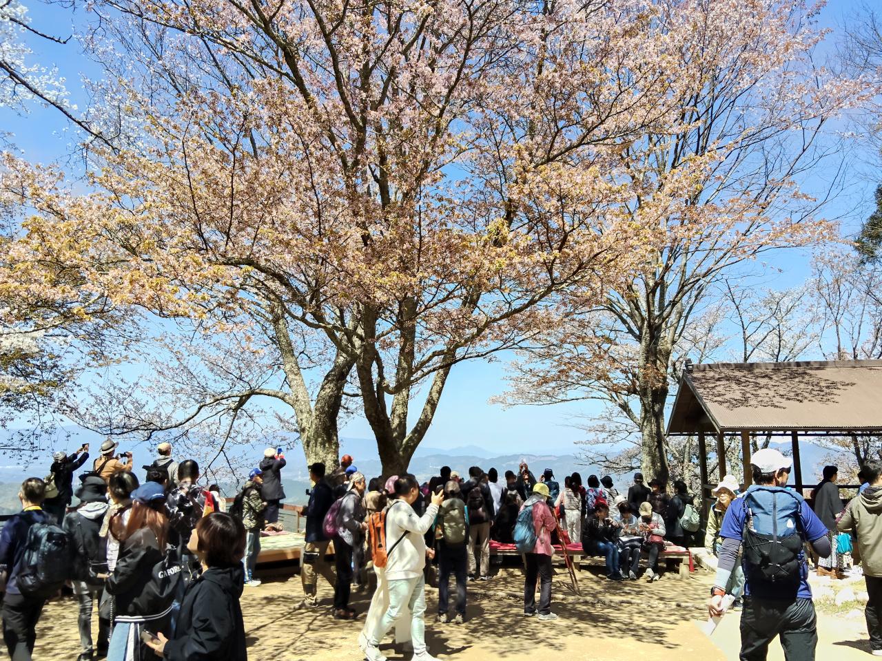 下千本の展望台からの眺め。山の上下で開花時期に若干差があり、下千本は満開を過ぎているかも。