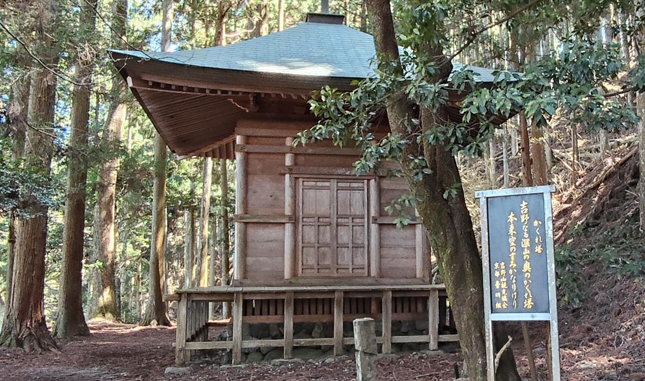 神社に向かって左手奥に”義経隠れ塔”がある。源義経と弁慶ら一行は頼朝の追っ手から吉野山に逃れ、ここのひそんだと言われる。