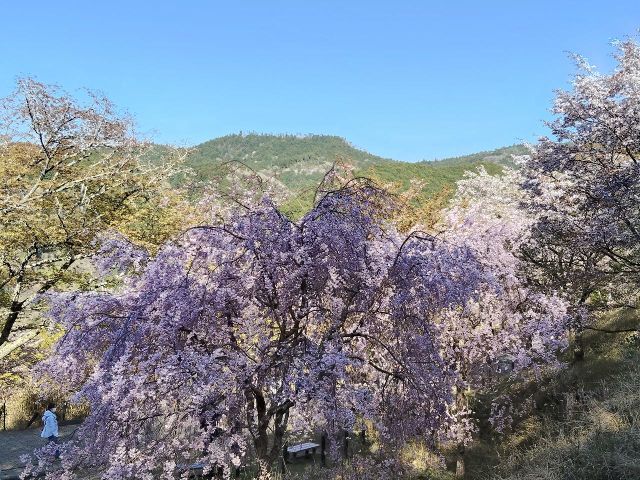 下千本のしだれ桜。光の加減か、写真では紫がかって見える。