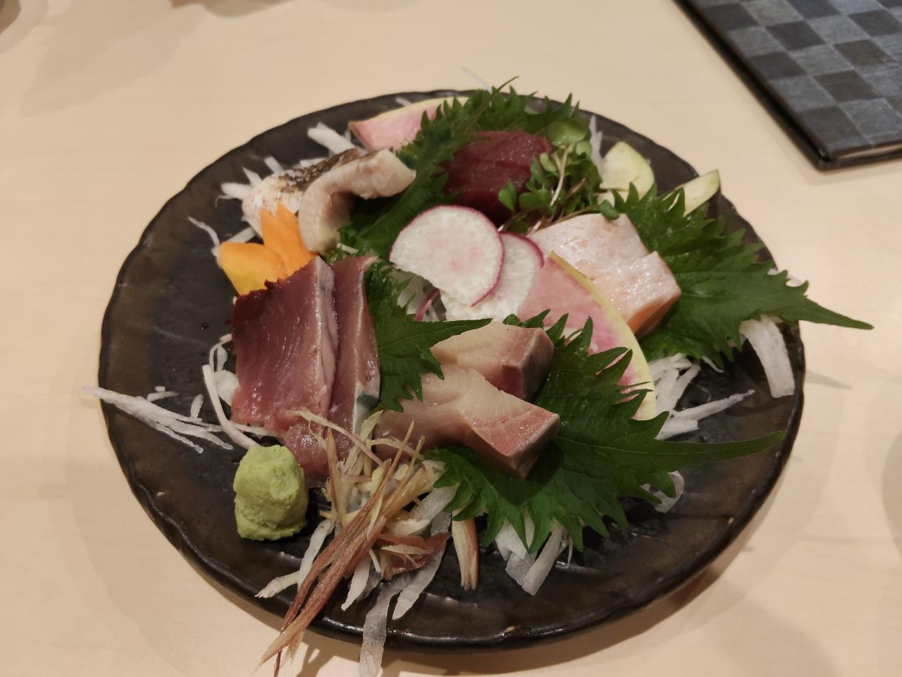 刺身5点盛り。刺身は豪快に厚い。 -