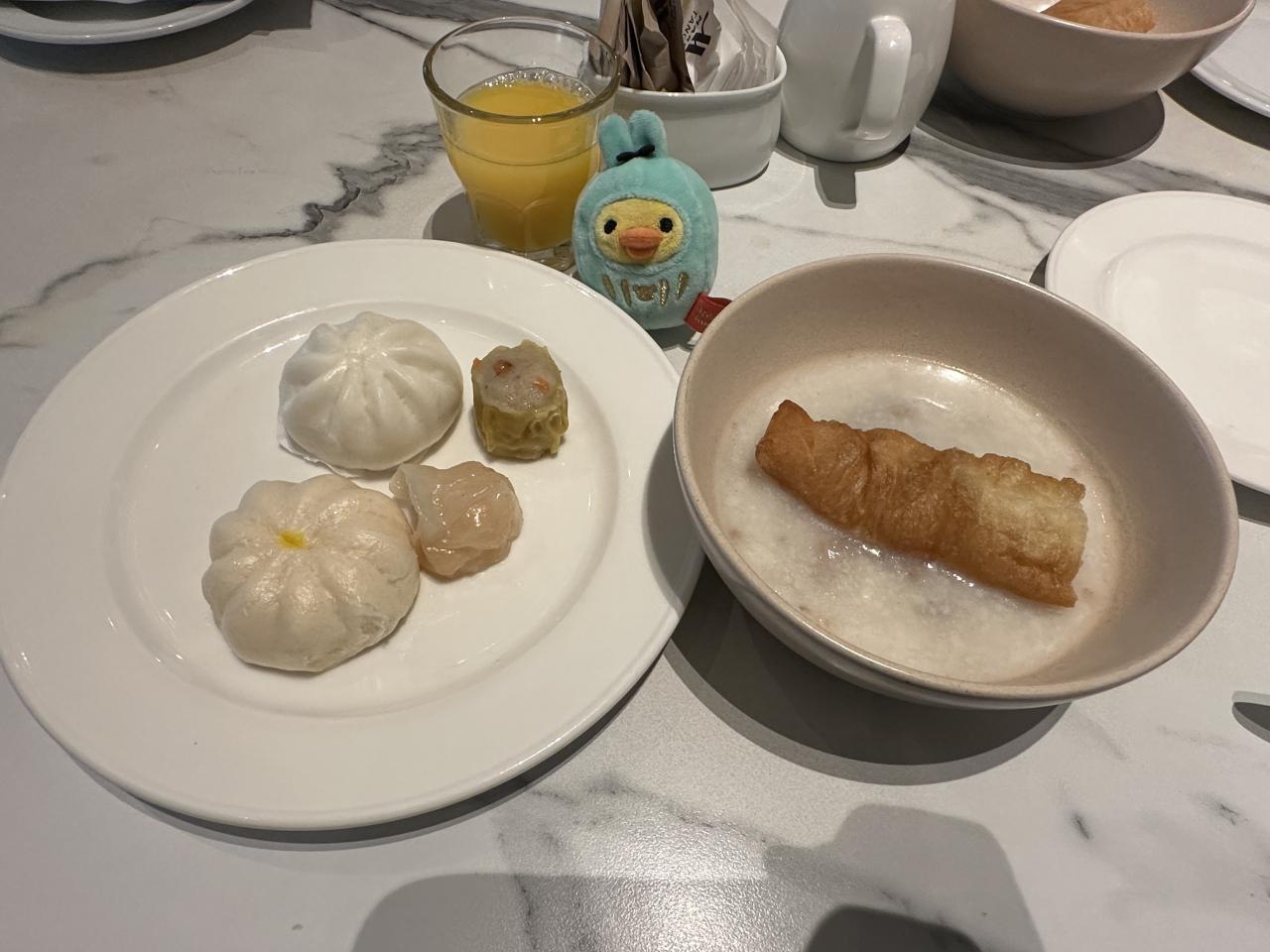 ローストダック粥と油条。