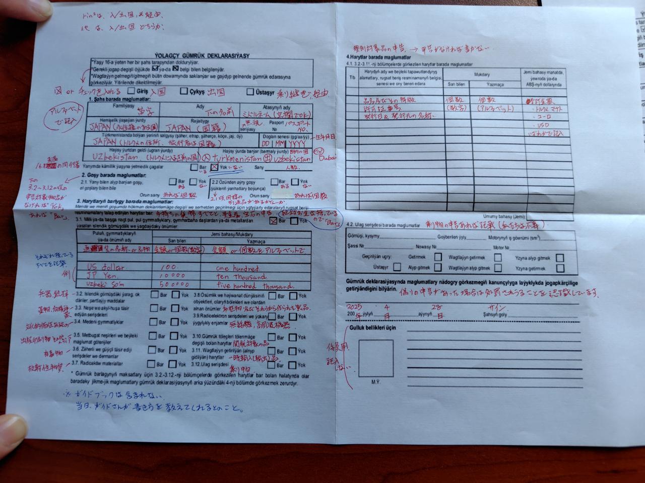 トルクメのイミグレに出す入国カード。