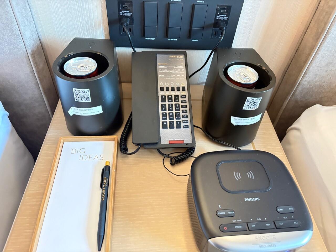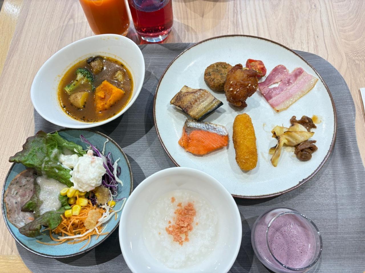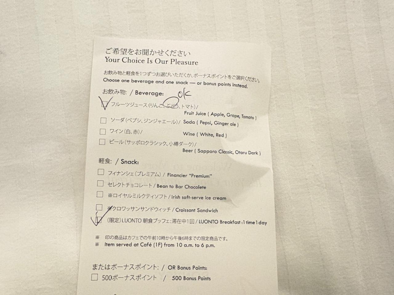 マリオットプラチナ特典は、飲み物と軽食からひとつずつ。期間限定で朝食が選択できたので、ジュースと朝食にしました。美味しいジュースです。