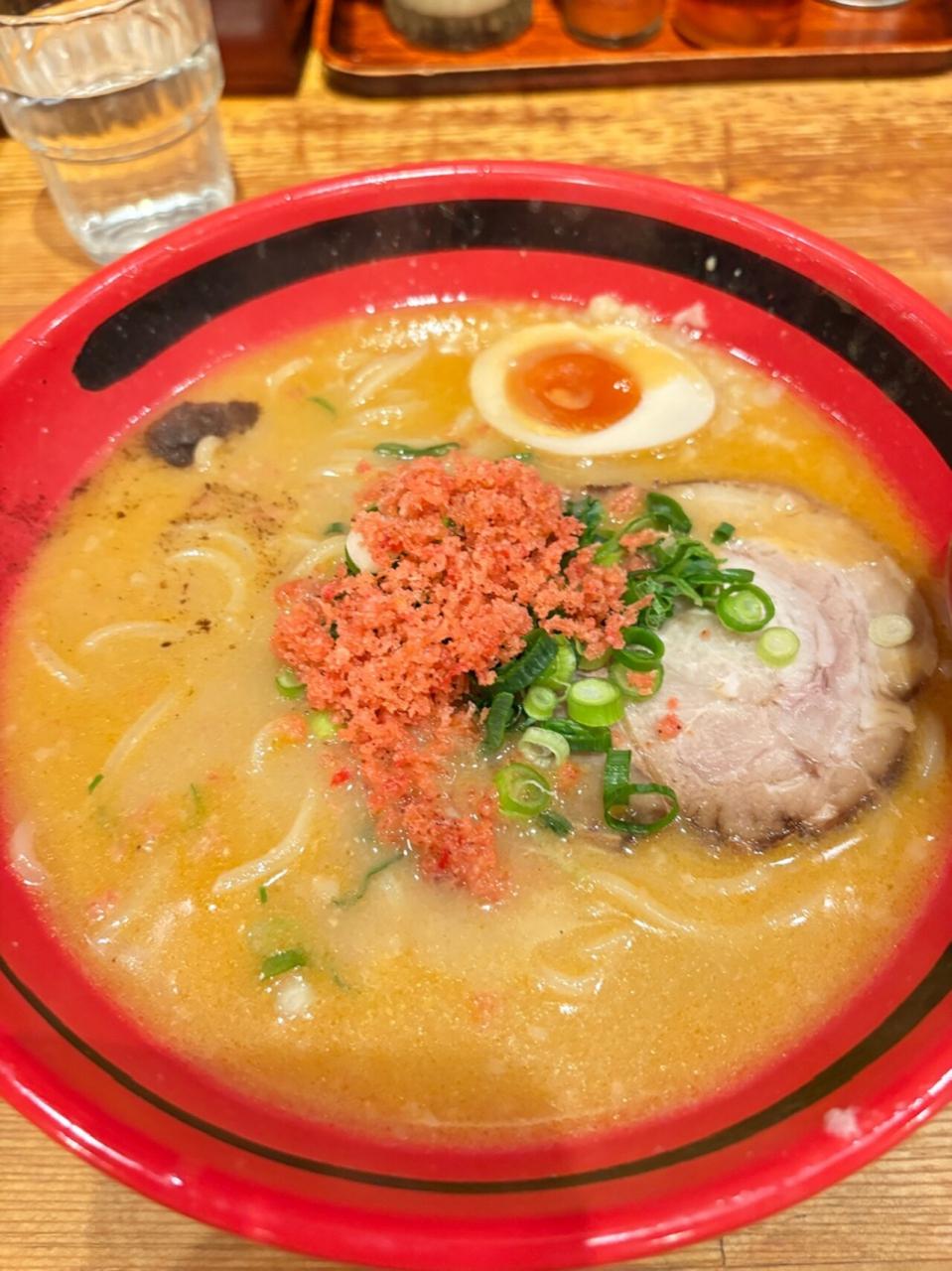 インスタントのしか食べたことがなく、海老が強いイメージでしたが、メニューには「海老スープだけ・豚骨スープとのハーフ・豚骨強め」の3種類があったので真ん中のハーフを選びました。スープは「塩・しょうゆ・味噌」から味噌を選択。麺も細麺・太麺で選択できて太麺にしました。