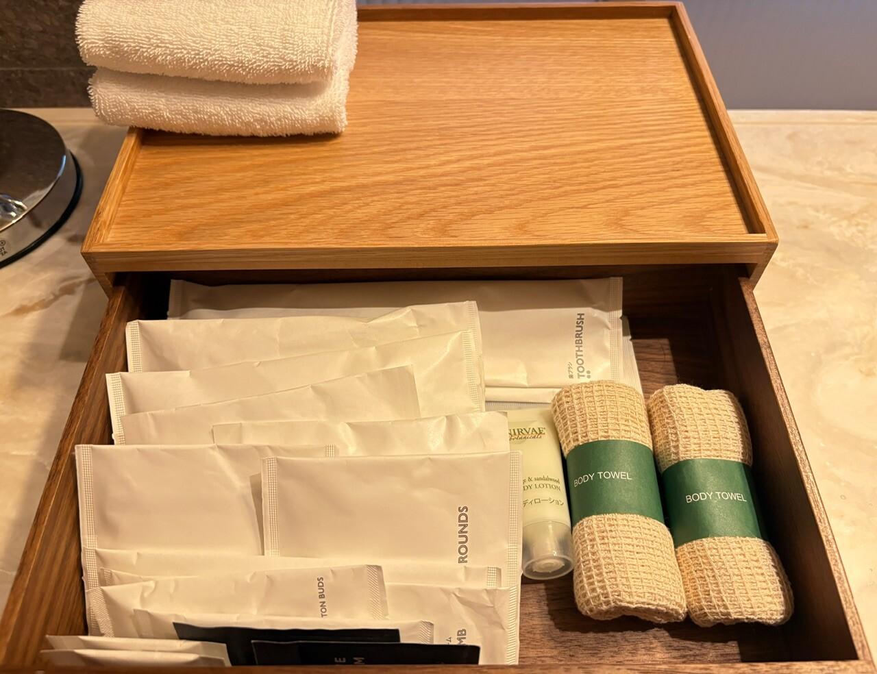 アメニティはすべて紙の袋に入ってます。歯磨き粉もチューブではなく小袋に入っていてエコ。使ってみると、なぜ今までチューブだったのかと思えてきました。