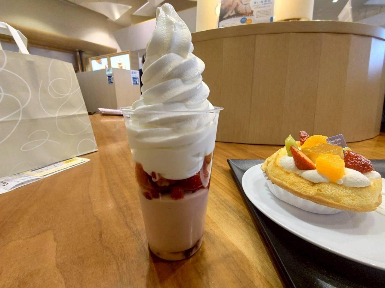 お寿司を食べた後は大通りにある「きのとや」のカフェへ。いちごプリンの上にソフトが乗ったパフェとオムパフェ。