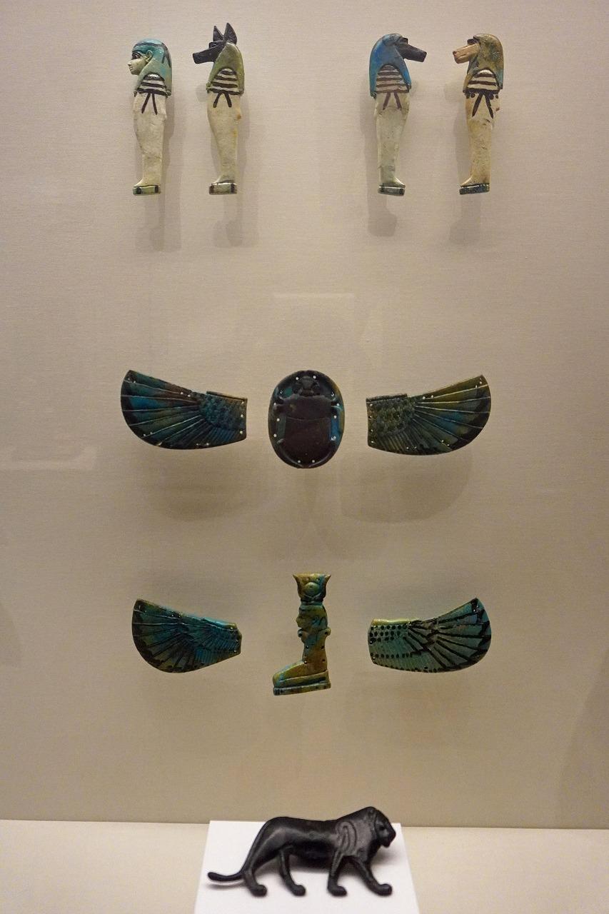 上段4体は「ホルス神の息子たち」、「翼のあるスカラベ」、「翼のある女神イシス」、「ライオン」