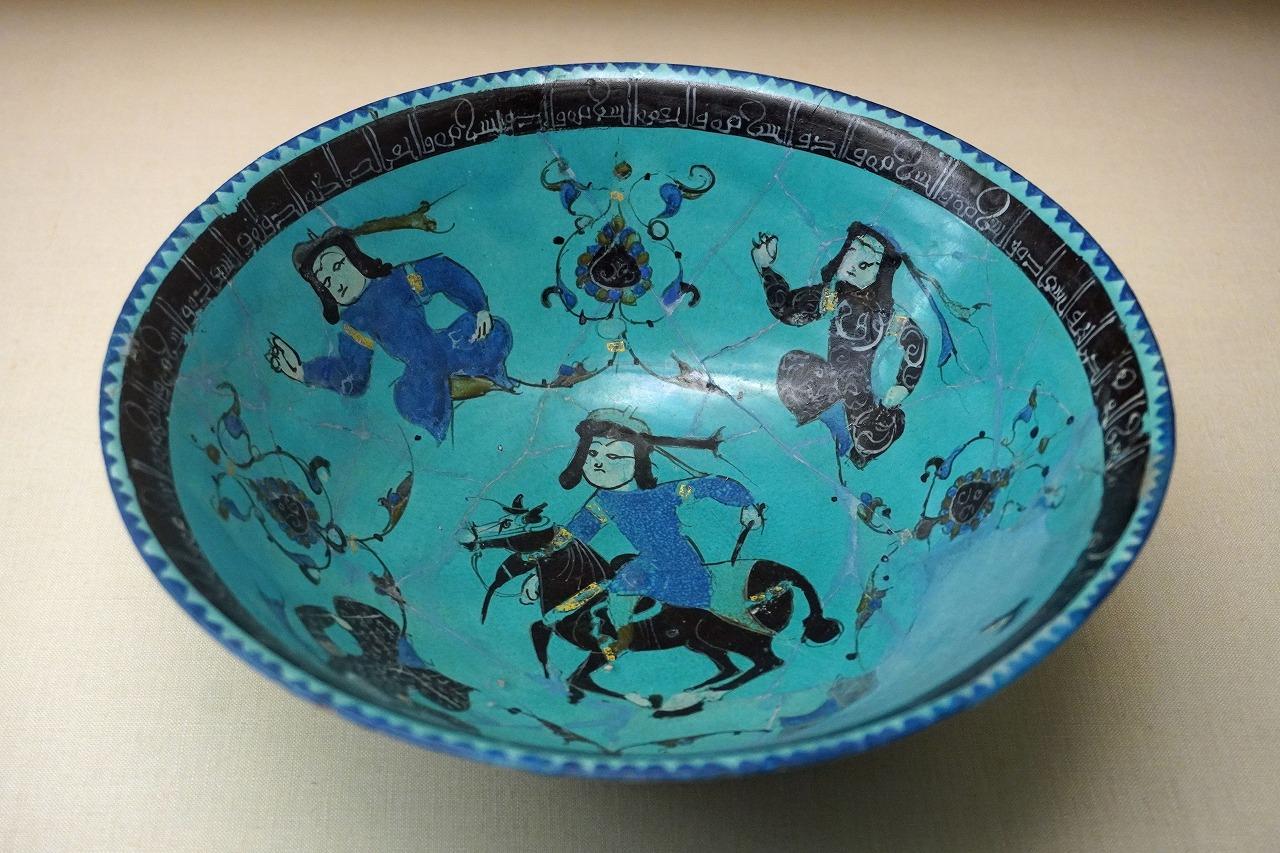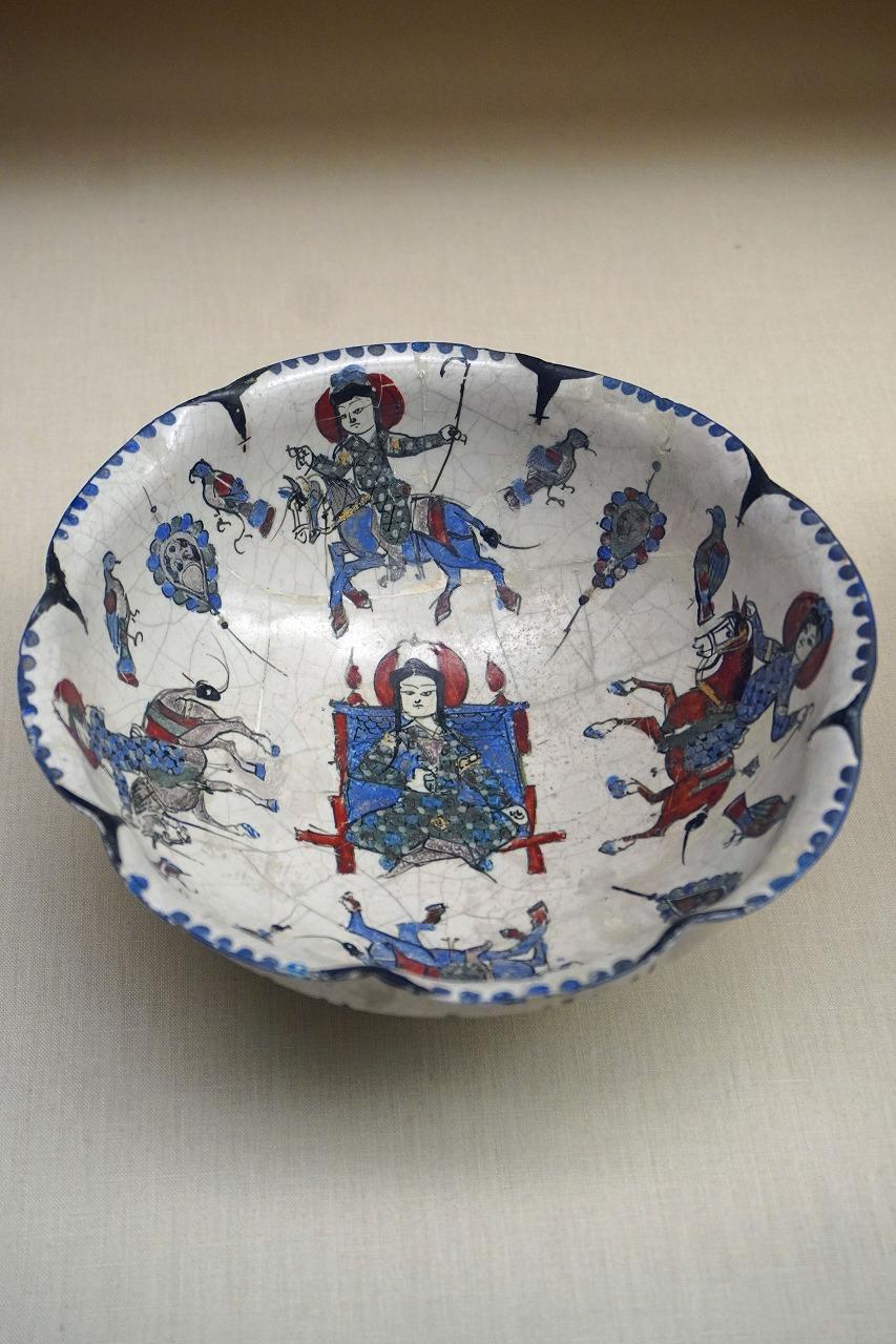 13世紀のペルシャで造られたミナイ手の彩釉陶器の鉢です。エナメルによる多彩な色遣いが特徴で、ミナイはペルシャ語でエナメルを意味します。
