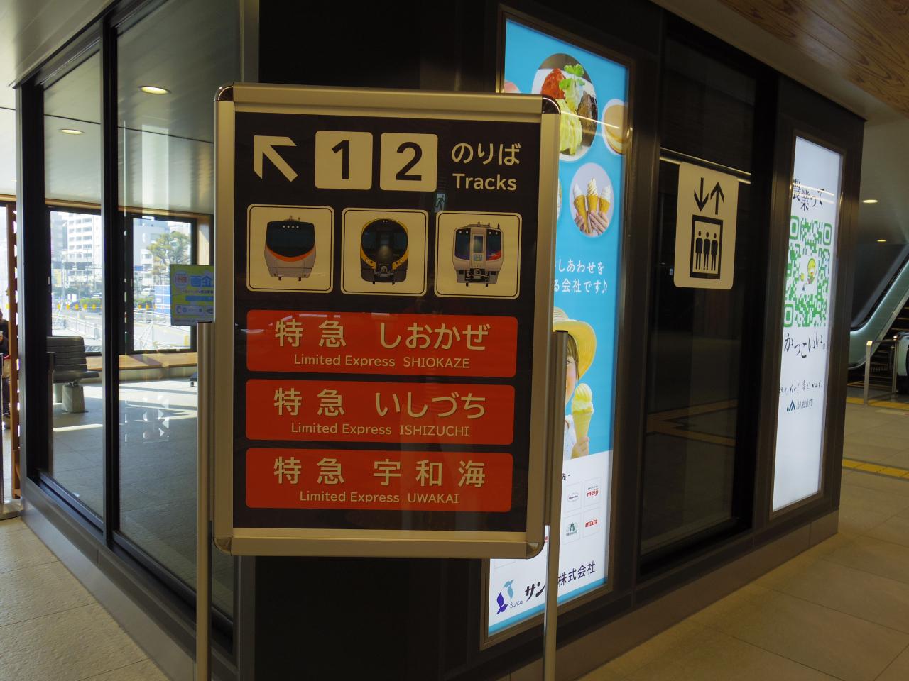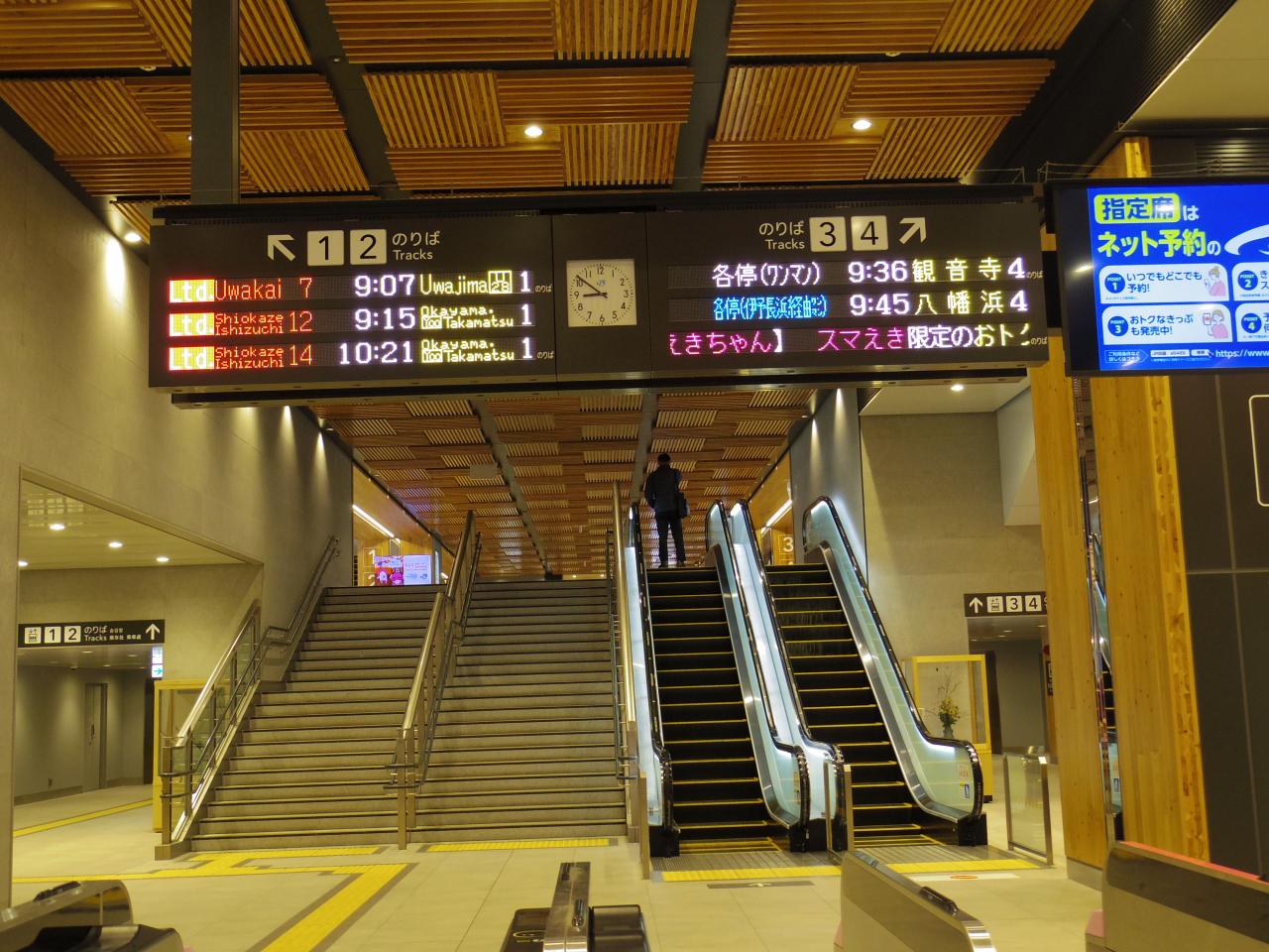 電光掲示板の「Uwajima」の右のマークと「Takamatsu」の左のマークが何なのか、気になります。 -