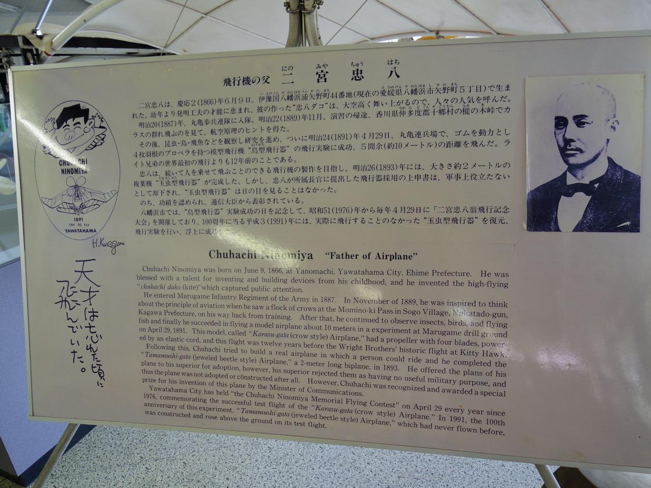 説明によると、八幡浜に生まれた二宮忠八さんは発明工夫の才に恵まれていて、カラスの群れ飛ぶのをみて航空原理のヒントを得、その後研究を重ねて遂に明治24年4月29日鳥型飛行機の実験で約30メートルを飛び、それはライト兄弟の世界初の飛行よりも12年前だったのだそうです(ざっくり)。