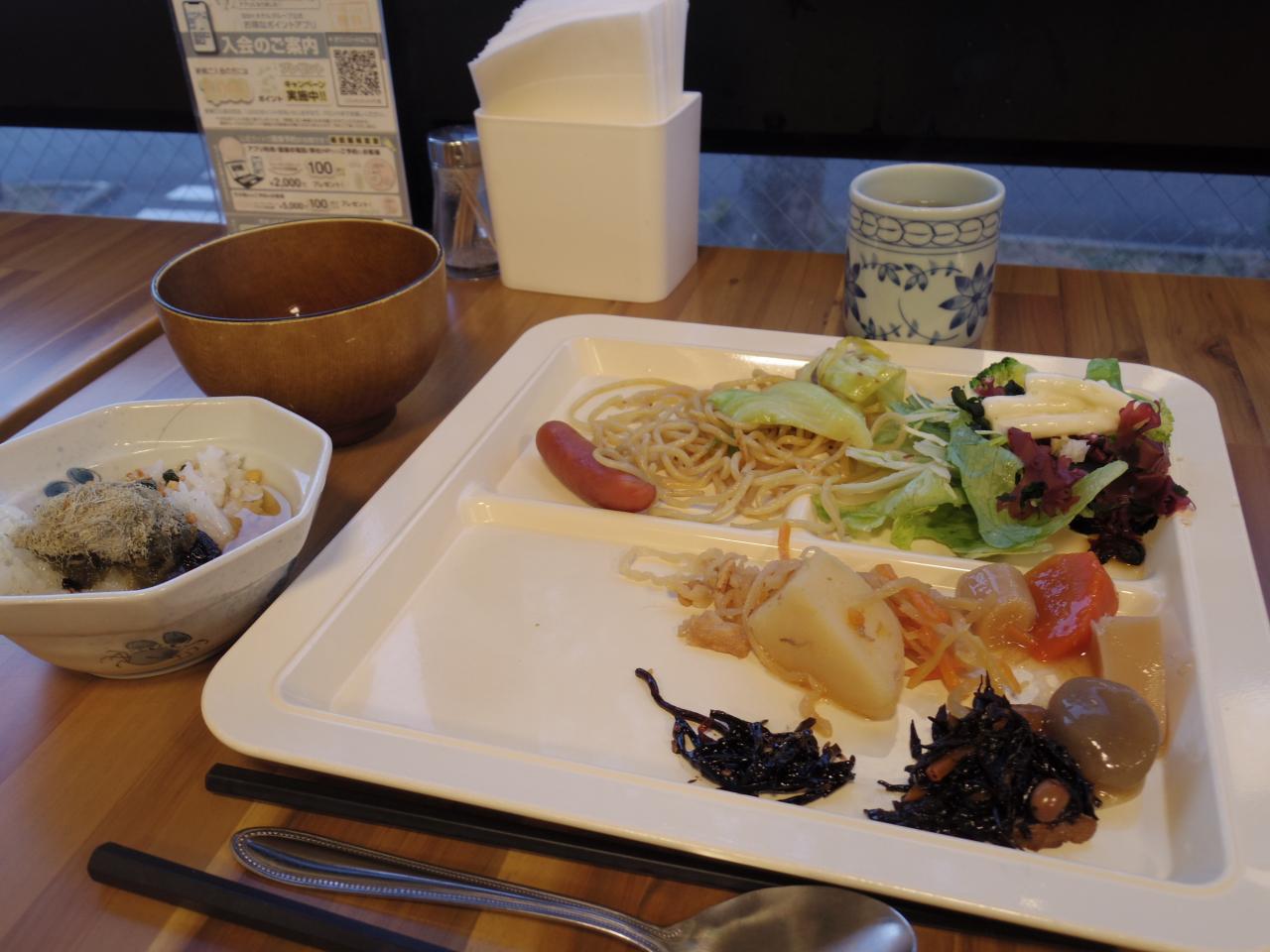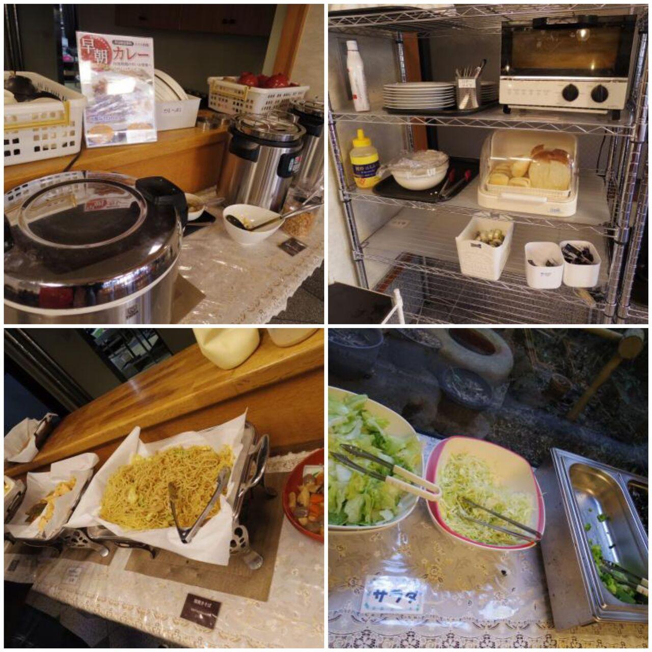 パンは2種類、ご飯、カレー、お味噌汁、煮物、塩焼きそば、かぼちゃとじゃがいもの煮物とか、生野菜やマカロニサラダなど。