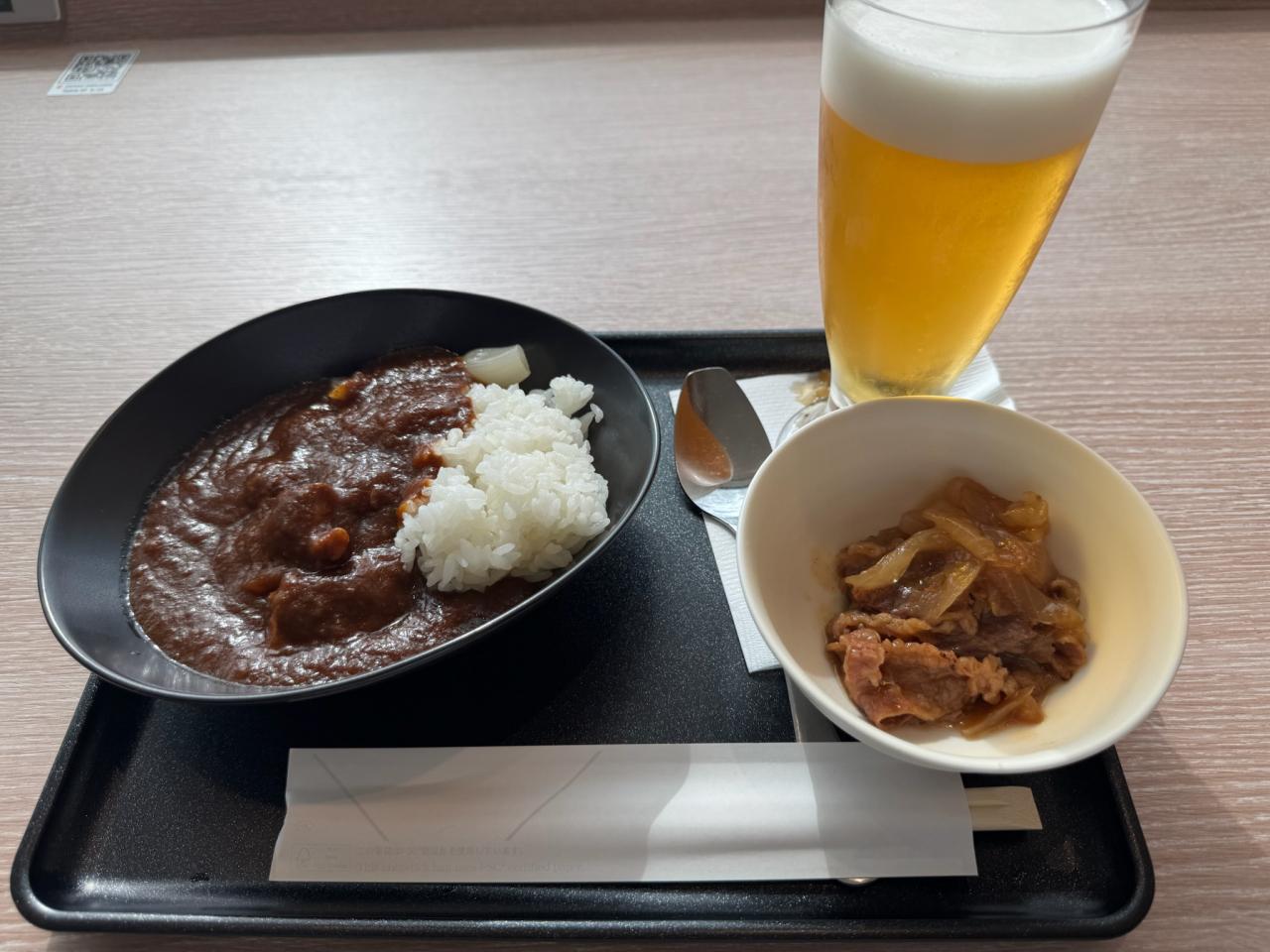 お目当てのJAL特製オリジナルビーフカレー、それに炭火焼牛カルビ、ビールを頂きます。カレーは牛肉ゴロゴロでしたがスパイシーさに欠け甘いだけの感じ。期待が妄想になっていたかな。