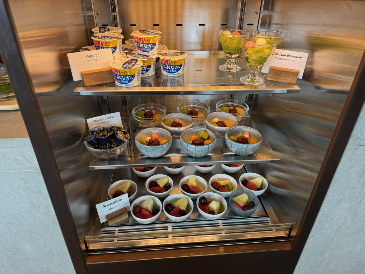 ダイニング出たところにある諸々。栗入りあんみつ、季節のフルーツ、宇治抹茶のババロア、ヨーグルト。