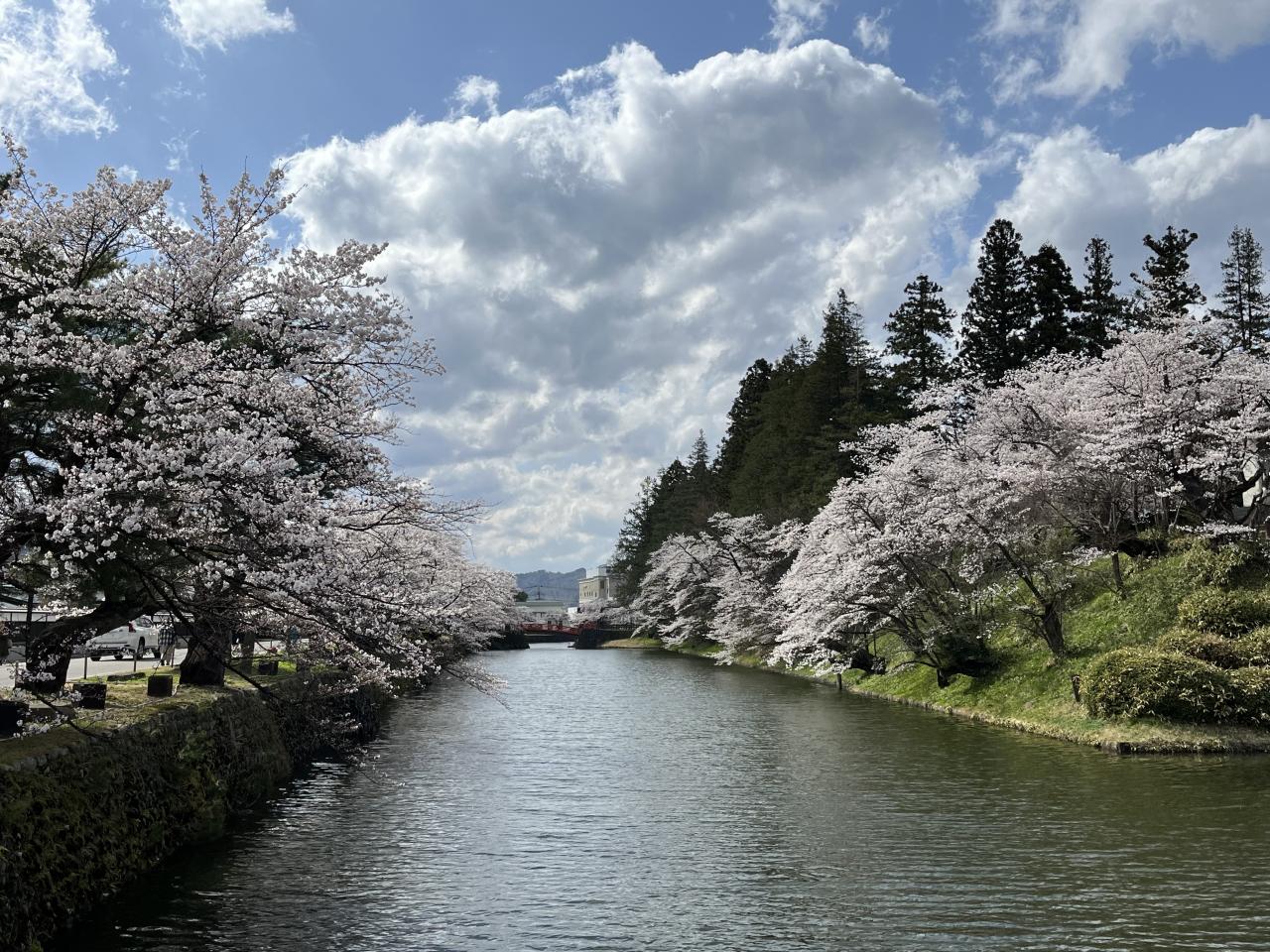上杉神社は米沢城址公園内にあります。城址公園はほぼ正方形の水堀に囲まれておりお堀端の満喫の桜に心が浮き立ちます。