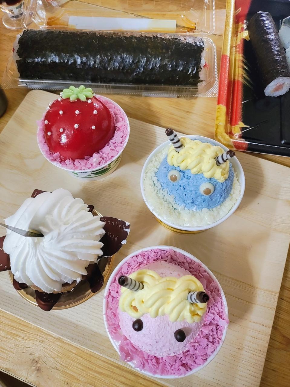 この数年の定番はま寿司、そしてかわいいシャトレーゼケーキを購入して、楽させてもらいましたー -