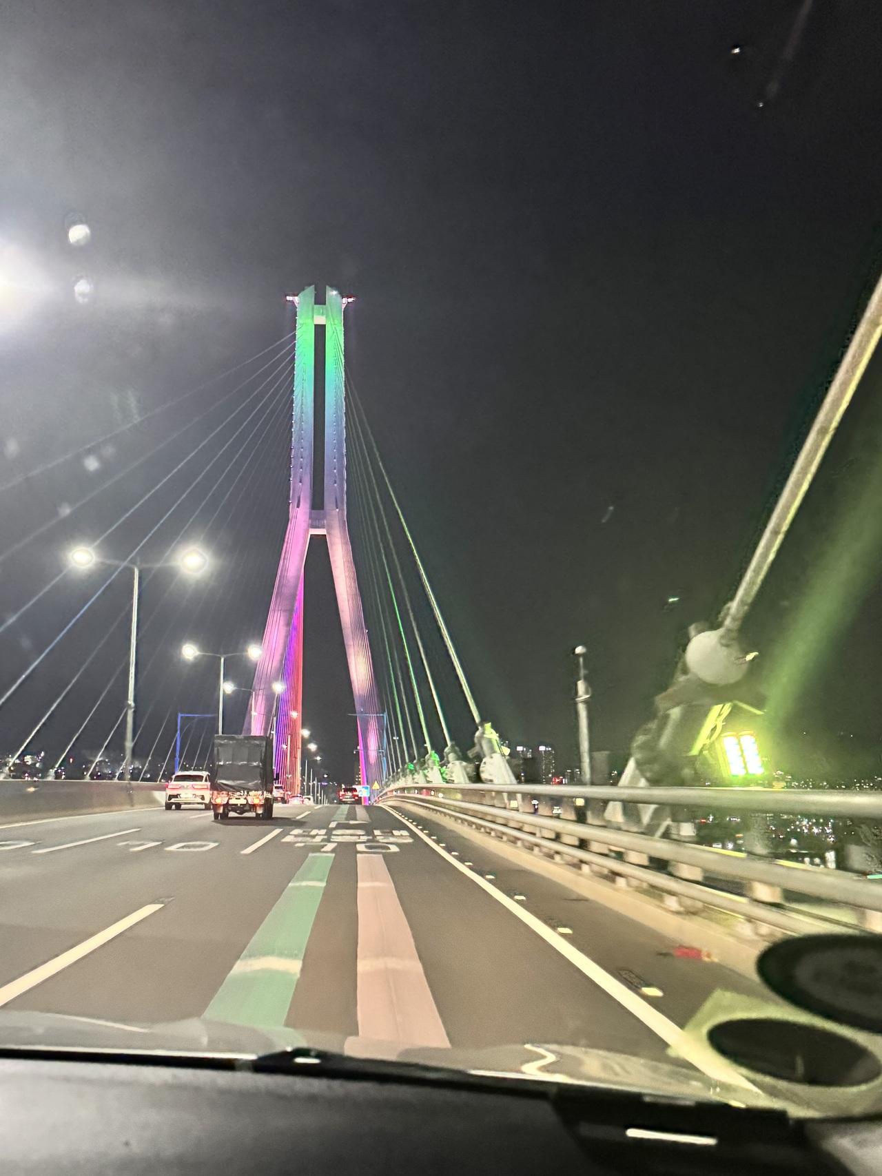 さっきまで見てた広安大橋を、猛スピードで渡るタクシー