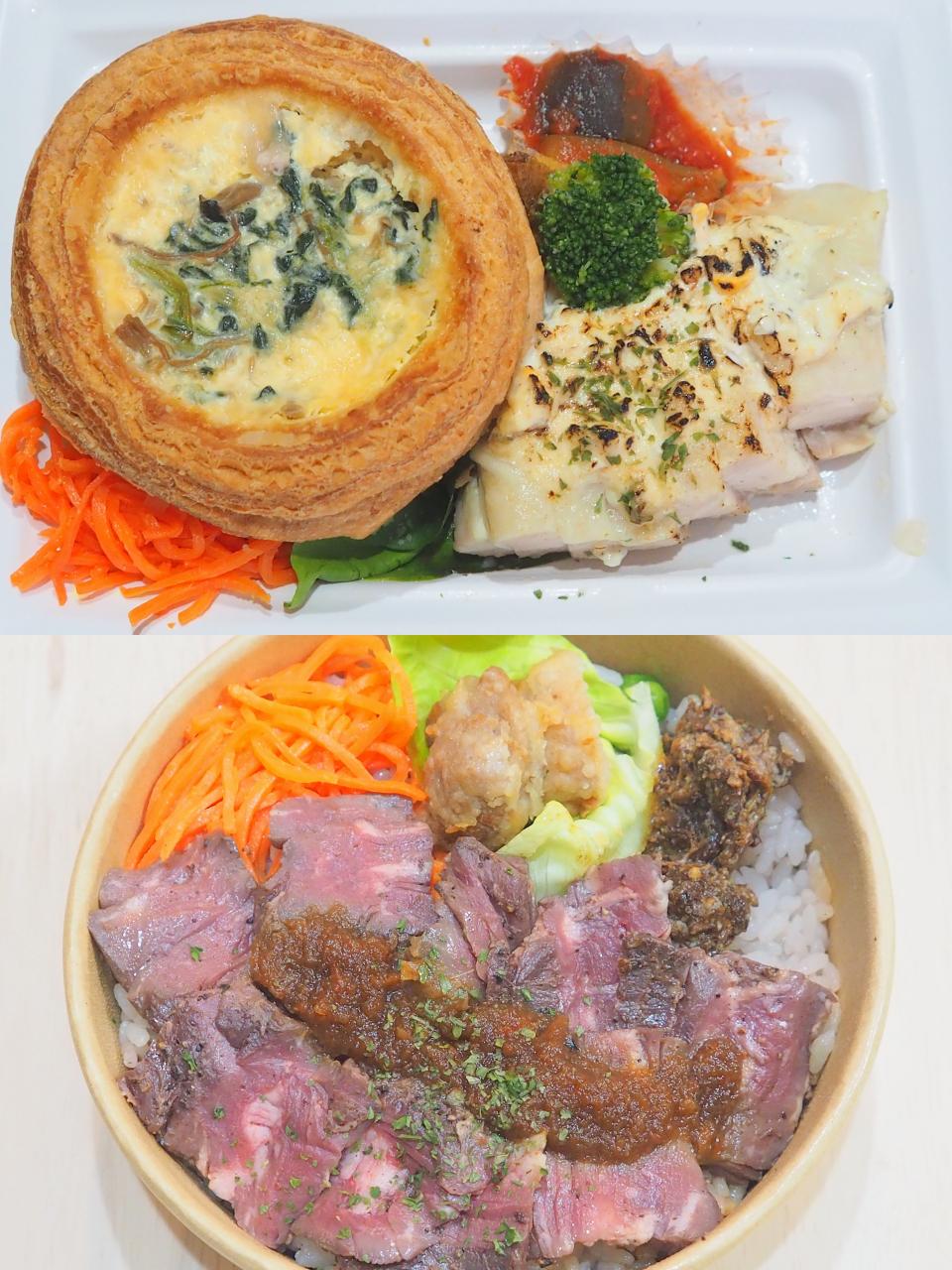 上:キッシュと鶏肉のお弁当