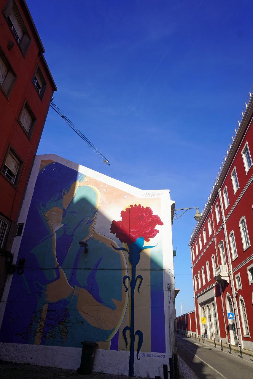 駅前の建物の壁にもカーネーション革命を思わせるイラストが描かれています。ほぼ海岸線のレベルから丘の上にある教会までずっと坂道が続いています。