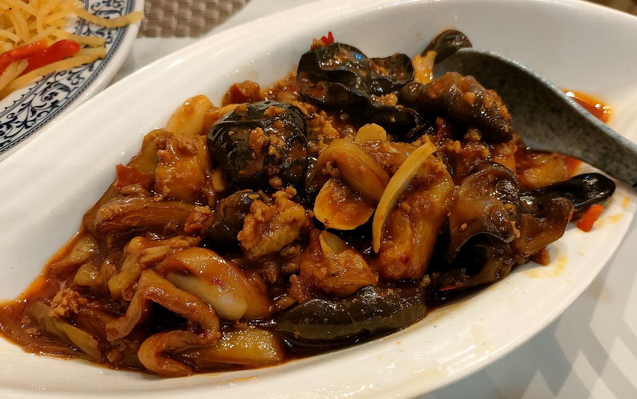 「茄子百合炒木耳」は揚げたナスときくらげと豚肉を炒めたものです。これも美味しい料理でした。ヨーロッパで中華を食べると本国から駆けg離れてしまう店もあるので要注意なのですが、この店は正統派な料理が出てきます。