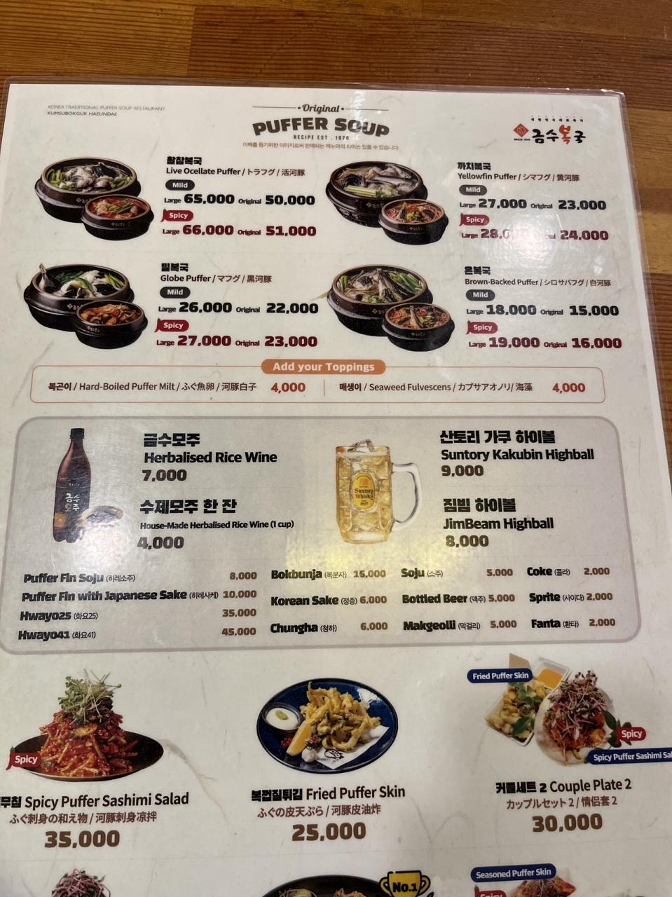 2日目の夕飯はミシュラン獲得のフグ料理のお店「クムスポックッ」