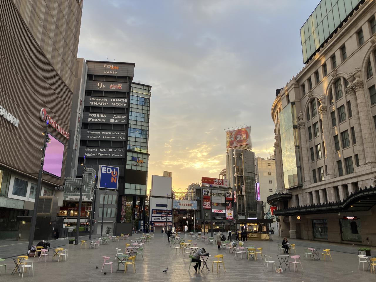 なんば駅(=高島屋)前は道路を廃して広場になっています。ここで夜を明かしたのかぐったりした人々散見。コロナやら外国人観光客やらであまり足を運ばなくなったミナミの街。
