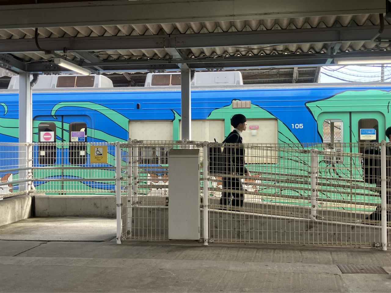 07:51「伊賀神戸(かんべ)駅」伊賀市。伊賀鉄道の忍者ラッピング電車が来ていました。高校生がたくさん乗り継いで行った。