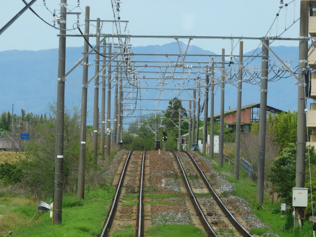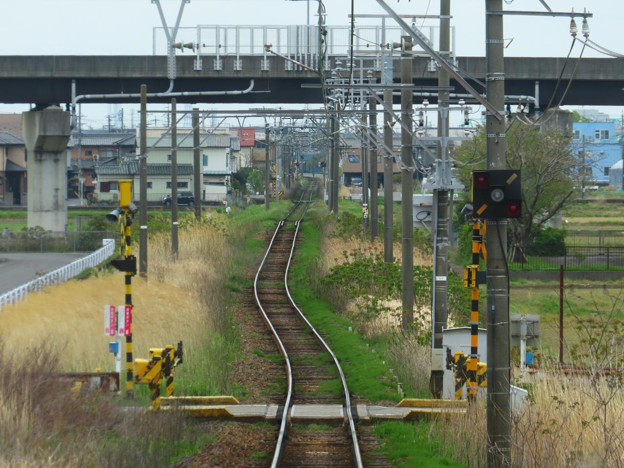 まっすぐ進むと須ヶ口方面の津島線。左カーブを行くと尾張一宮方面の尾西線。「尾西線」は尾張西部を南北に、弥富=津島=尾張一宮=玉ノ井の3区間に分割運行