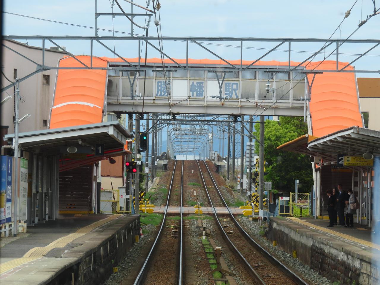 「勝幡(しょばた)駅」愛西市。跨線橋がカラフル。ほかに津島市・あま市など、あまり聞かない自治体がつづきました。
