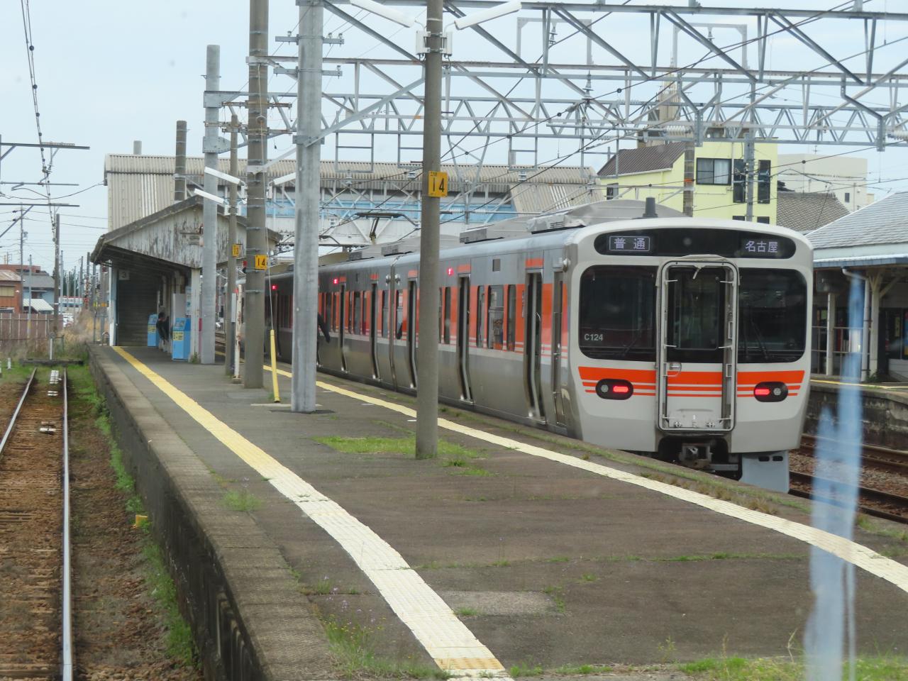 10:34「弥富駅」到着。弥富市。乗って来た電車。形式に詳しくないですが、けっこう古いタイプなのでは。