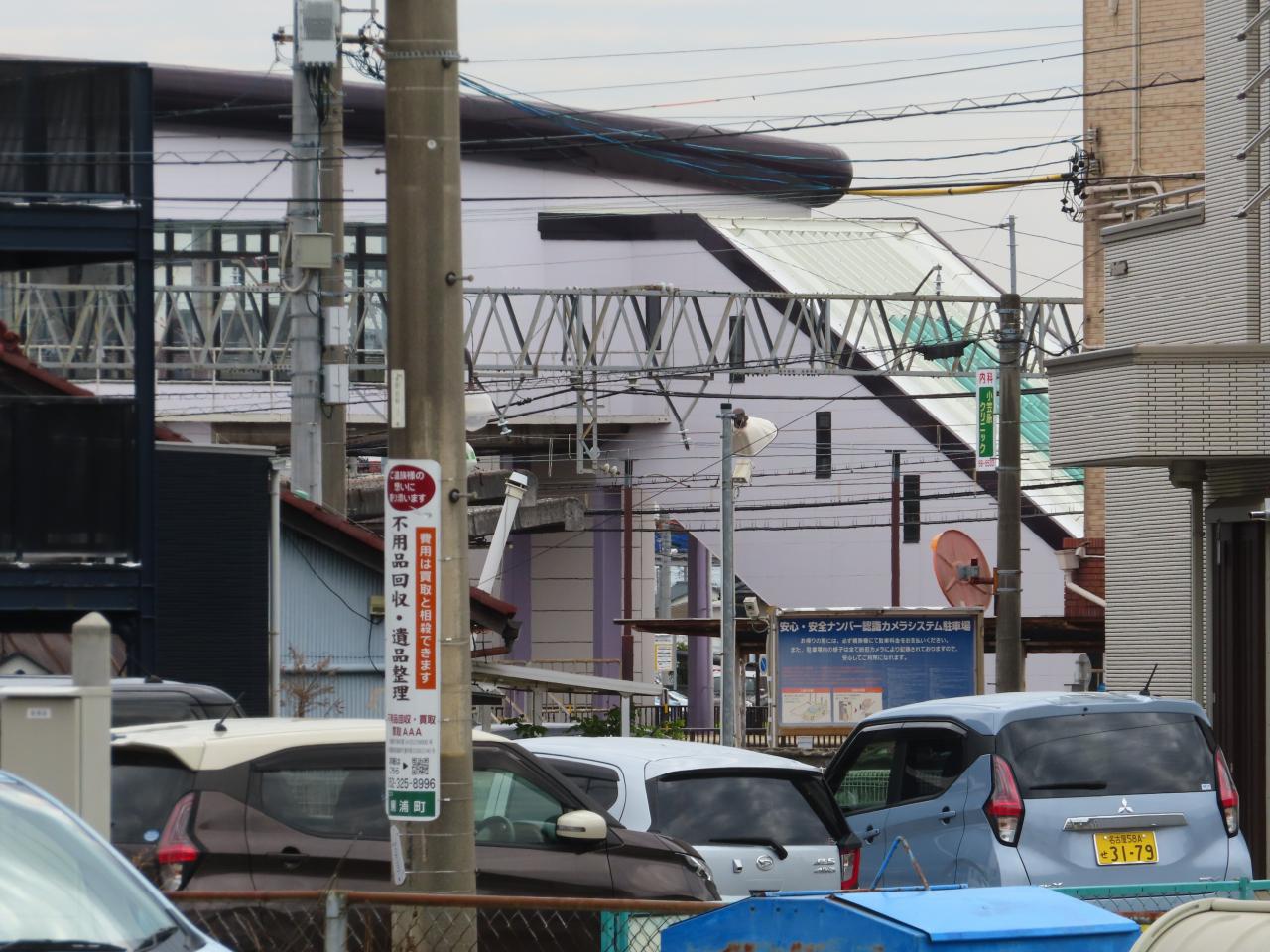 近鉄の弥富駅が、建物の隙間からわずかに見えました。
