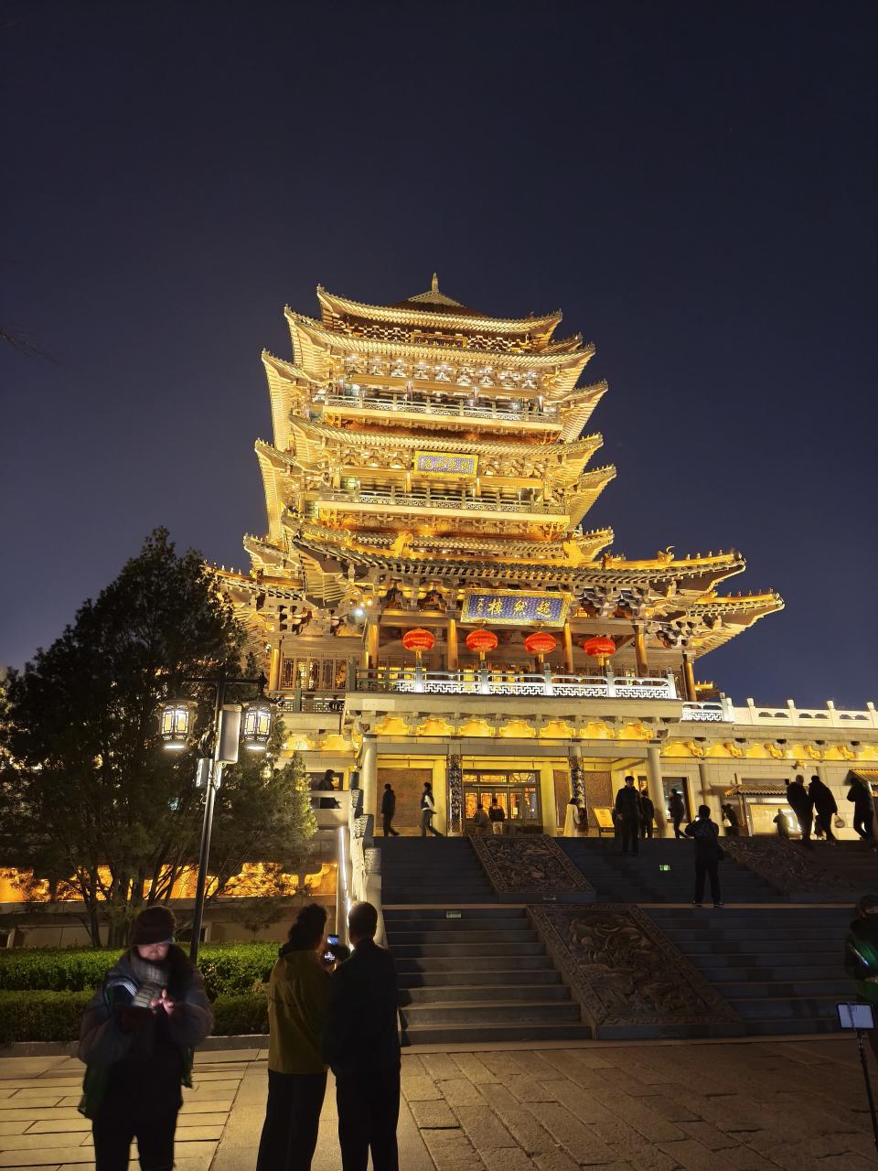 夜の「超然楼」を下から眺める。ライトアップがぎらぎらしていてきれいだ。