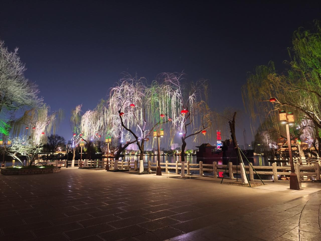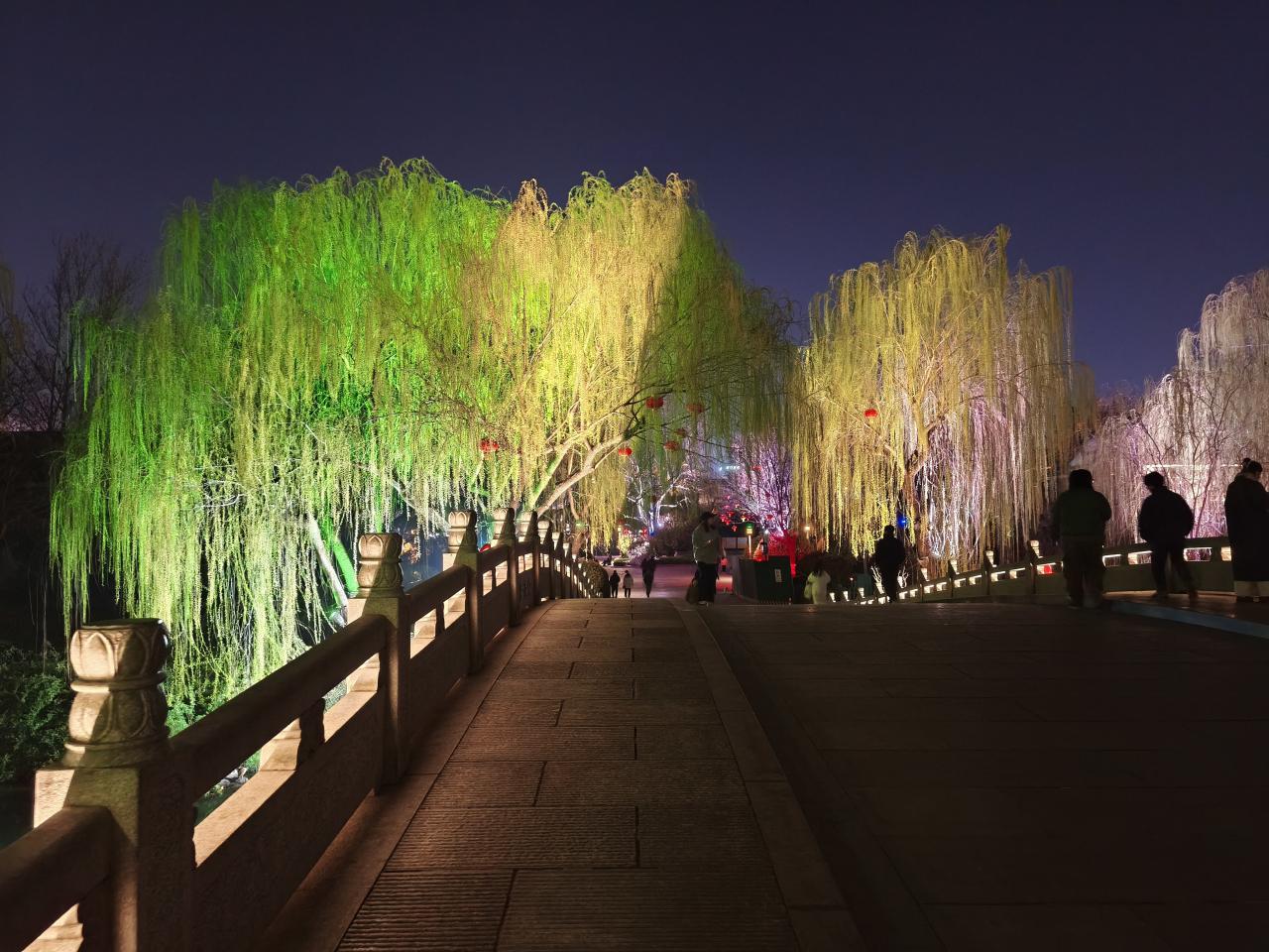 「超然楼」を後に公園の奥へと進む。柳がパステルカラーにライトアップされている。
