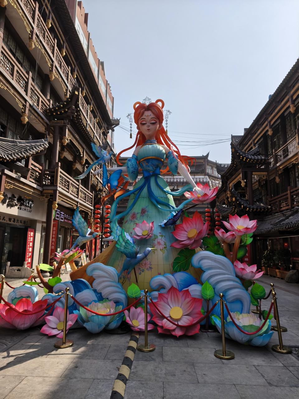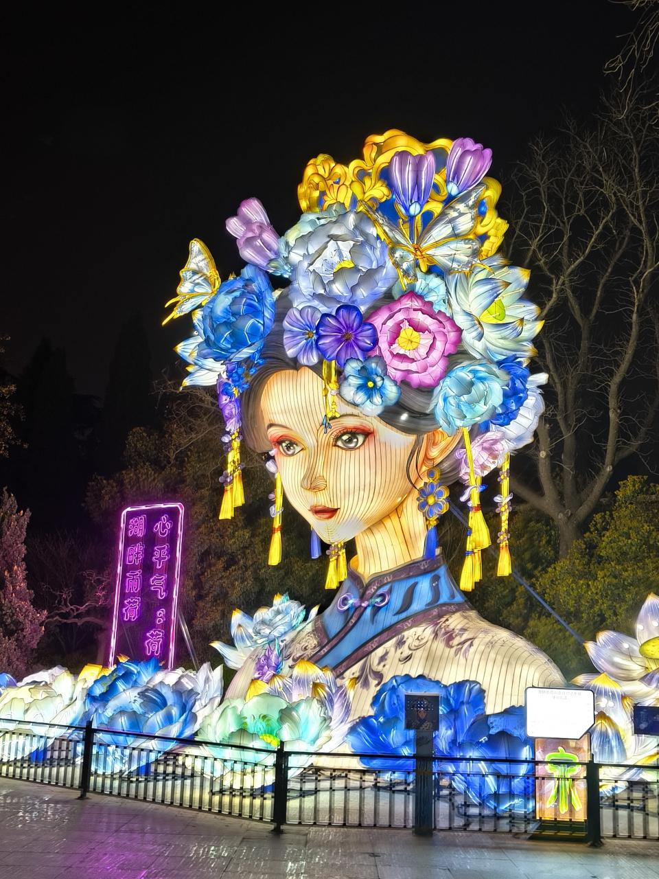 夏雨荷の巨大ランタンがあった。写真だと伝わらないが、このランタンは瞬きをする。また、「雨荷雨荷(ユーフーユーフー)」と呼びかけると、「我在!(ウォザイ!:いるよ!)」と返事をしてくれるAI機能を搭載している。
