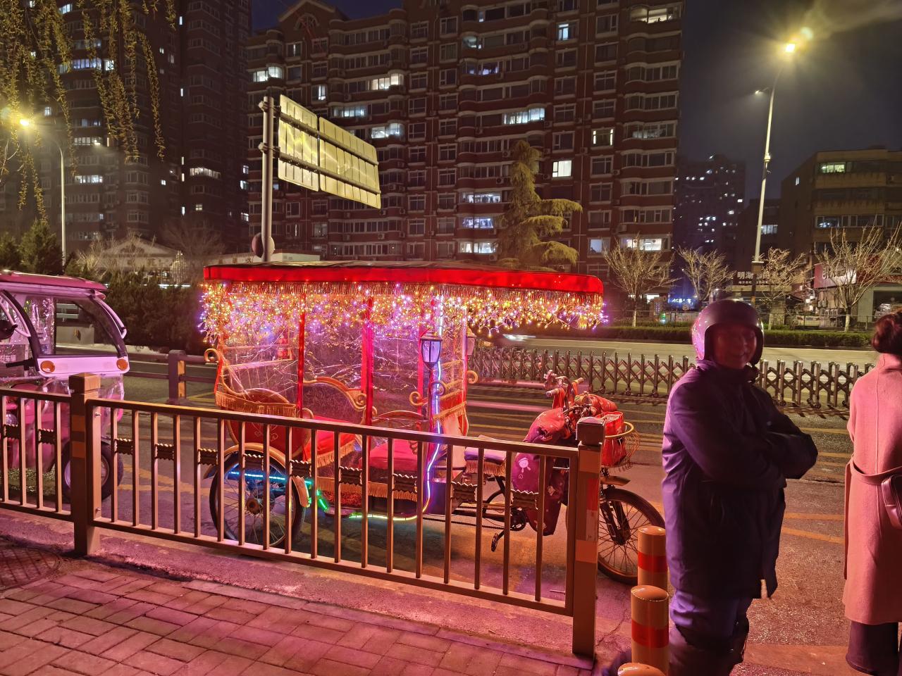 大明湖からホテルに戻ろうとすると、歌舞伎町みたいな色合いの三輪車タクシーが止まっていた。もちろん乗っていない