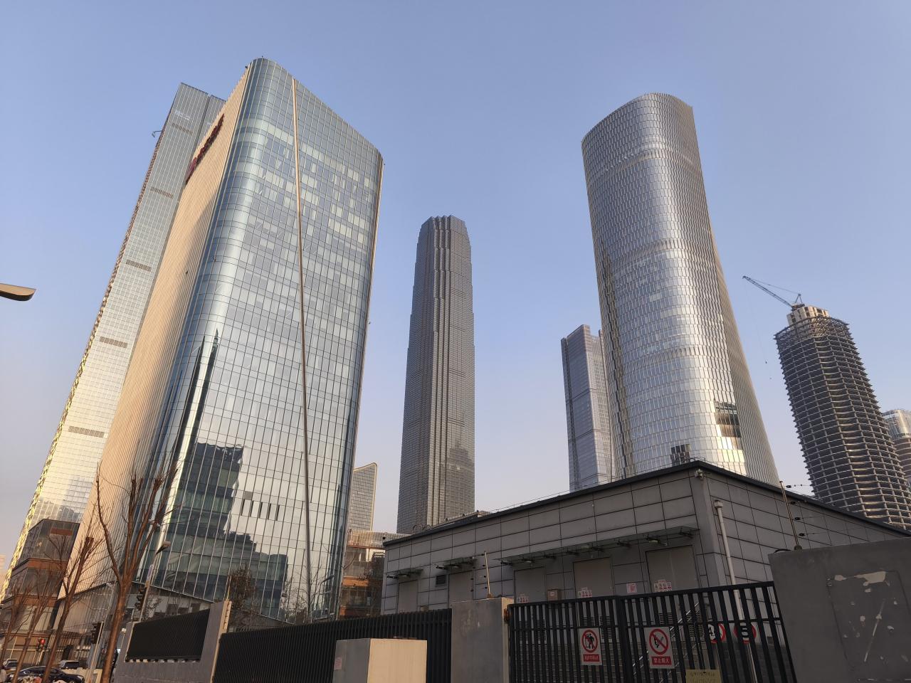 寛厚所街から地下鉄でホテルに戻る。ホテルそばにある高層ビル群が夕日に照らされていた。