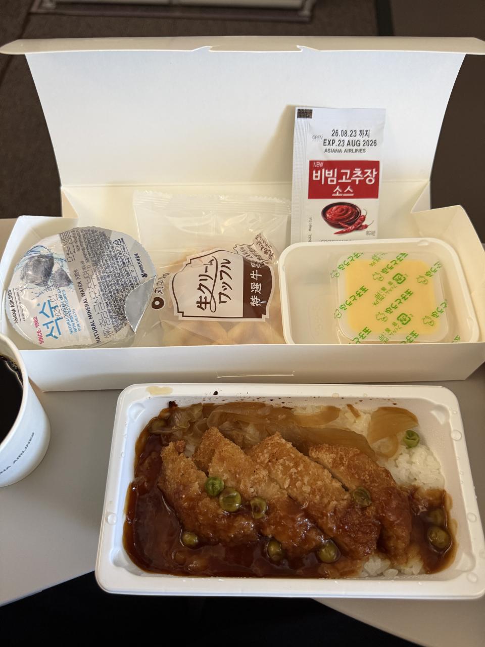 この時はカツ。正直、この時に食べた機内食が一番不味かったですね。