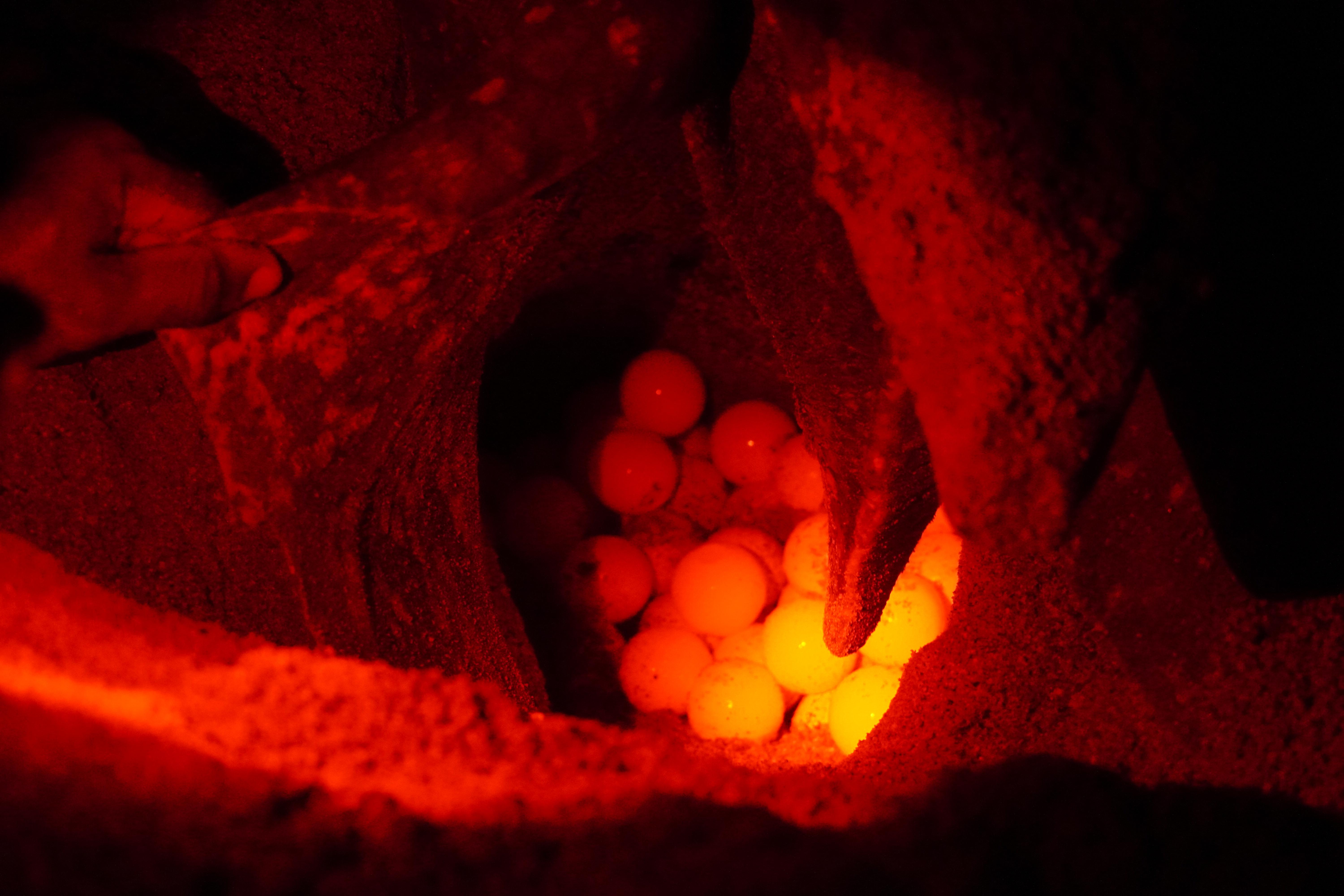 産み始めると、ガイドさんがそっと足を開いて卵の様子をみせてくれます。ピンポン球くらいの卵がいっぱいありました。