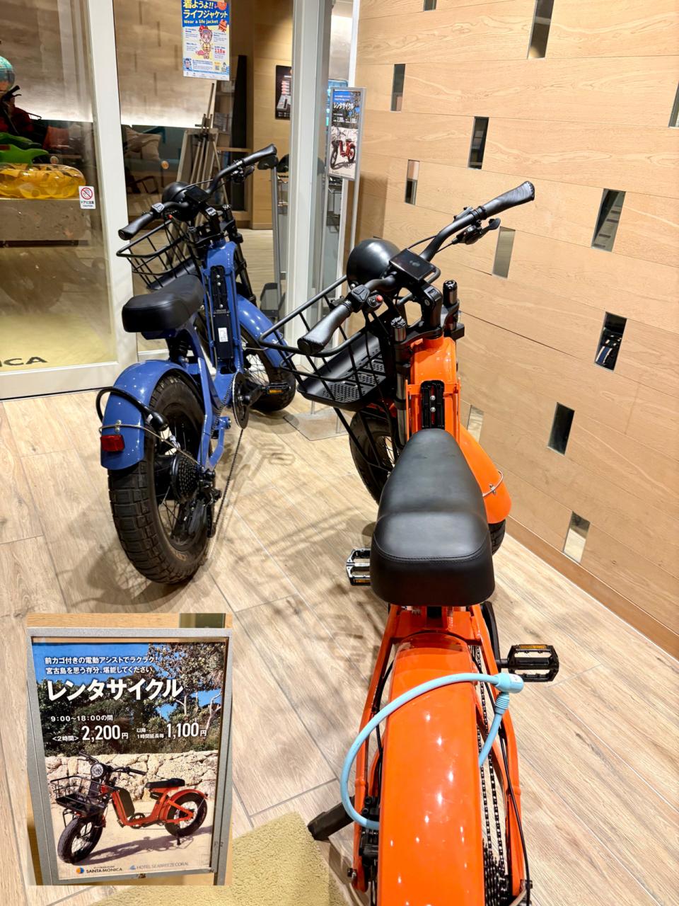 エントランスに置いてあった電動アシストレンタサイクル。これで宮古島を周遊すると楽しそう♬