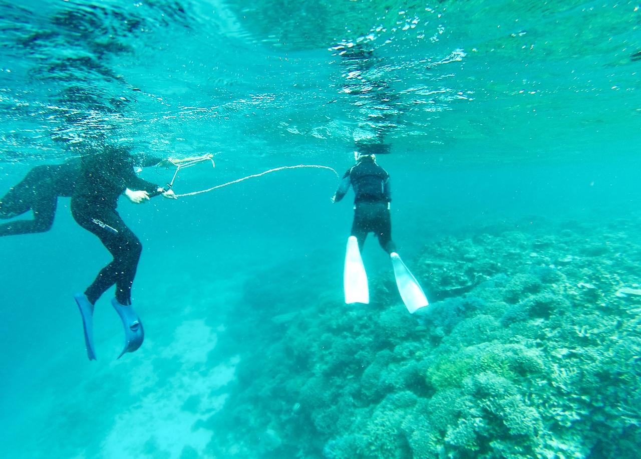 インストラクターが浮き輪の付いたロープを持ってポイントに移動します。
