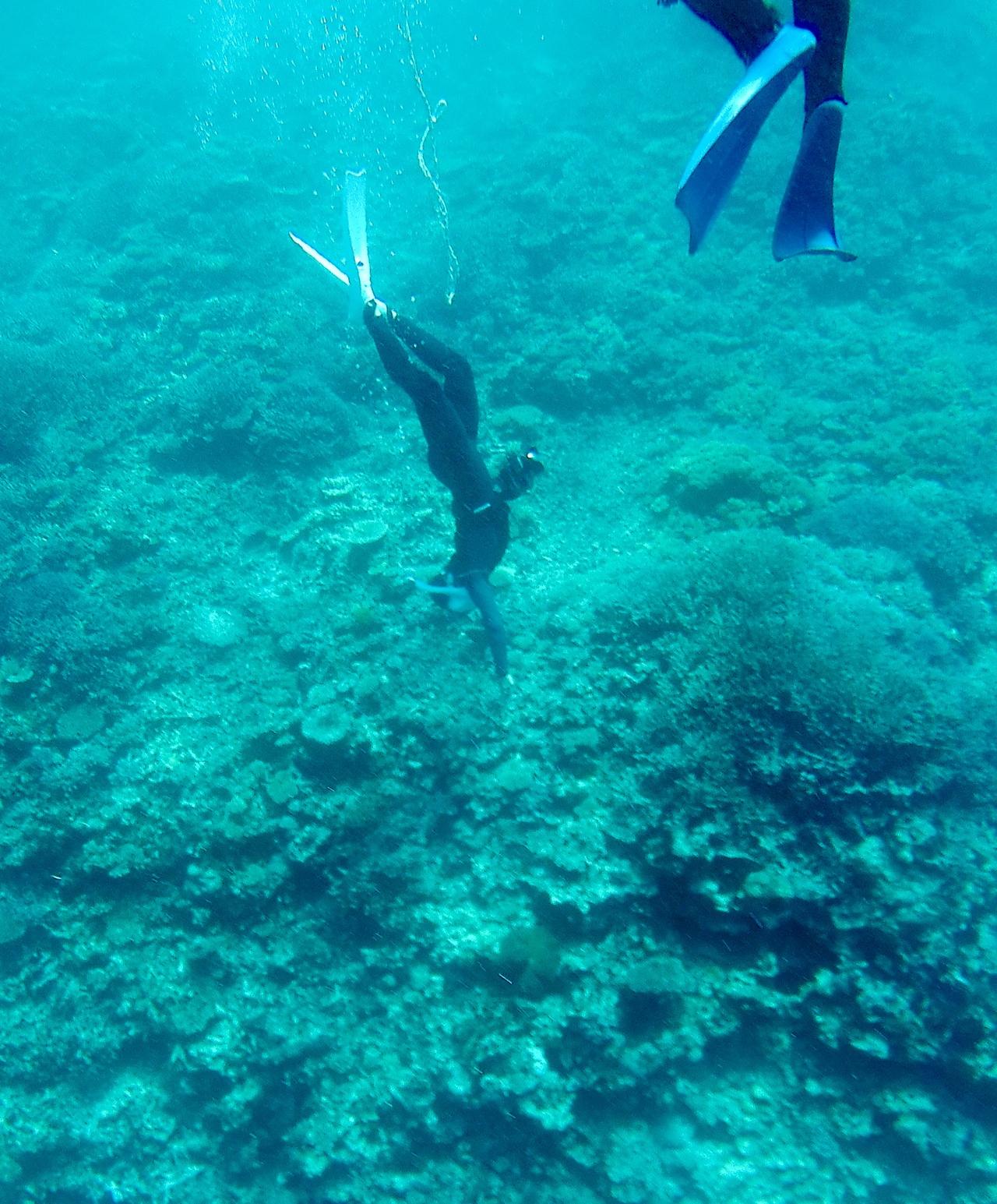 それにしてもインストラクターさん、シュノーケルで上手く潜れますね。自分も真似してみますが上手くいきません。「姿勢を下に向け、真っ直ぐにしていれば自然と潜れる…」とのことですが、なかなか難しい。。 -