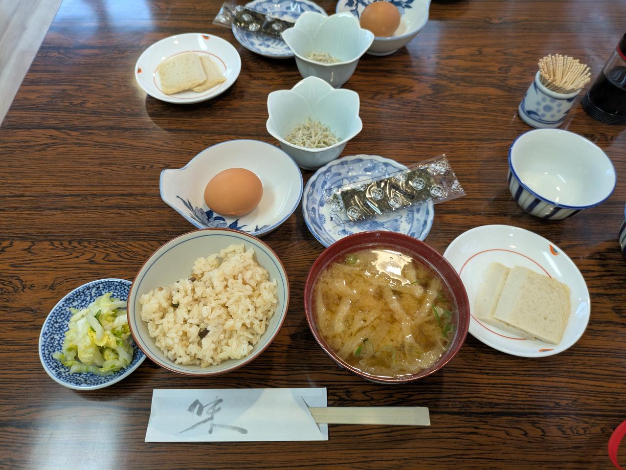旅館朝食。二杯目は白米にちりめん&生卵とする。 -