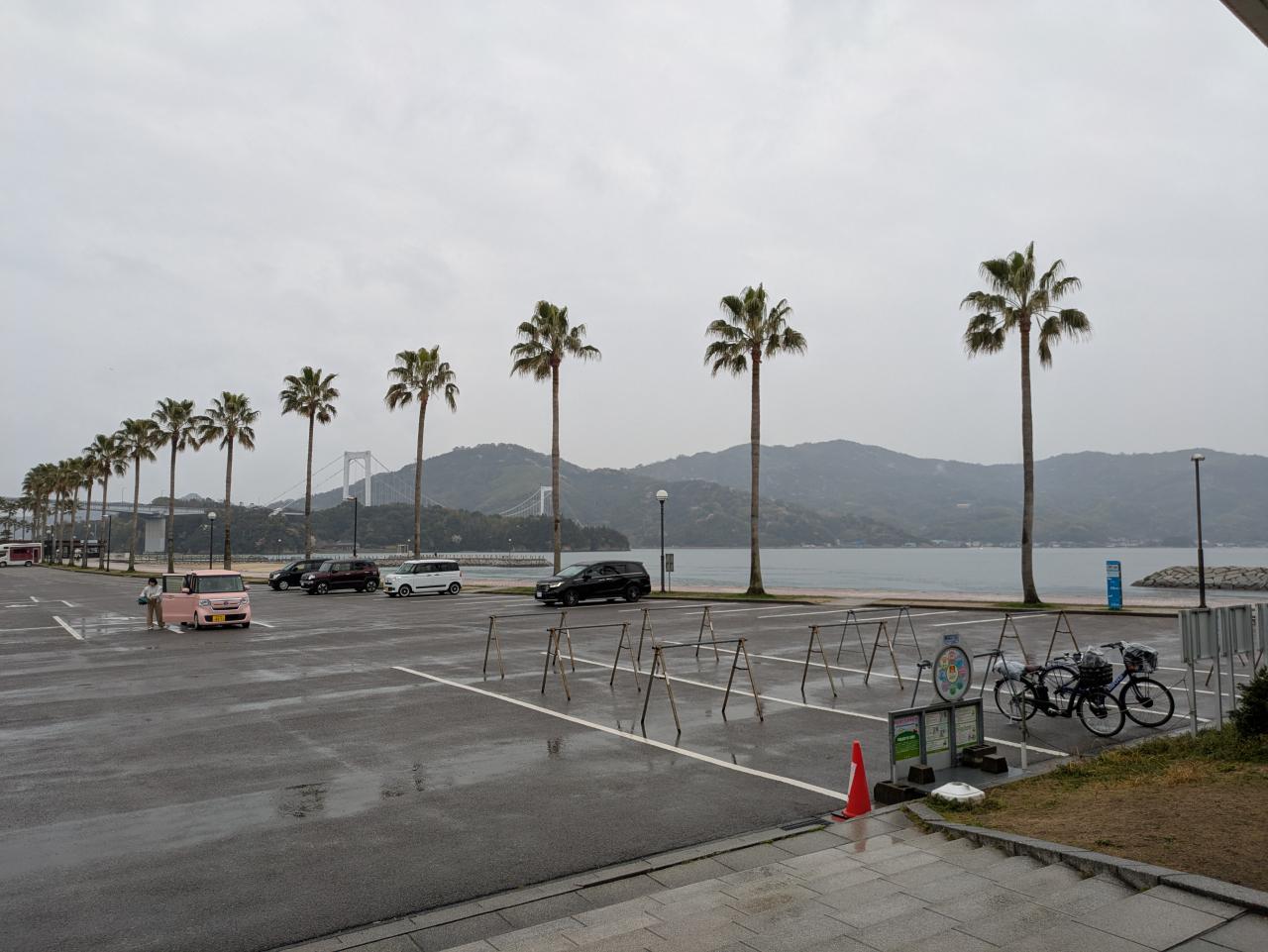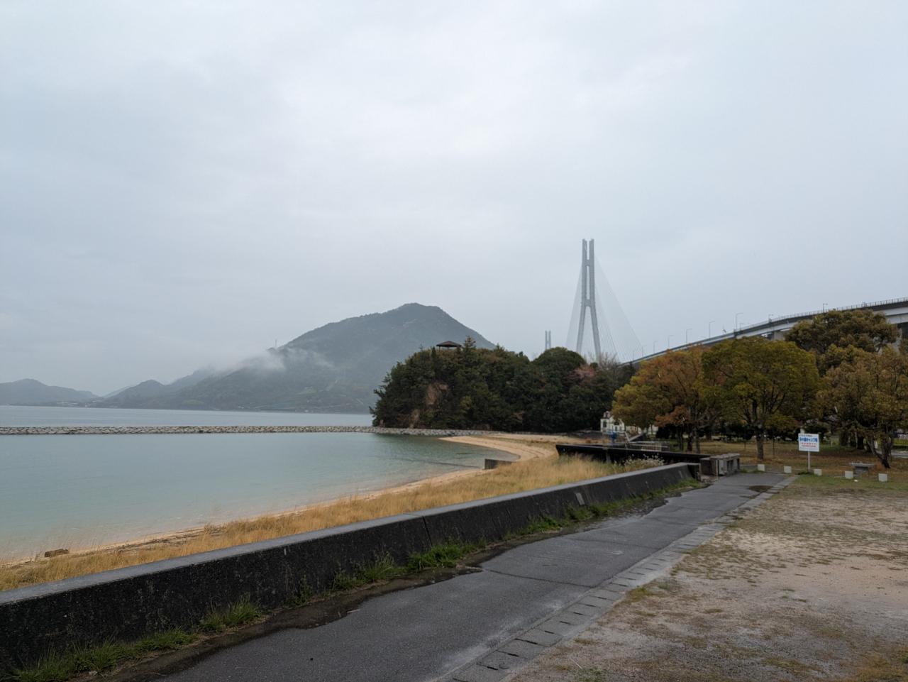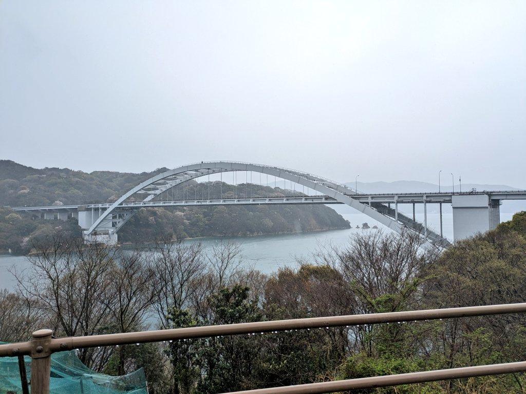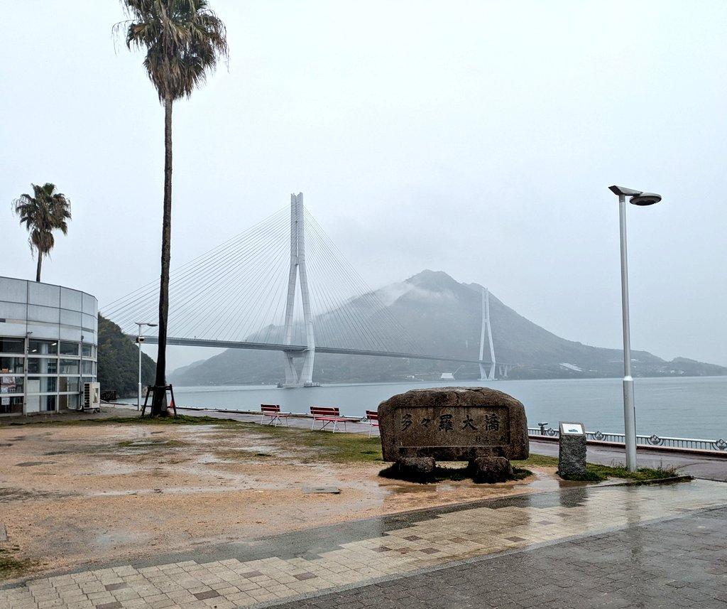 休憩所から大三島橋。天気が良ければゆっくり眺めるところだけれど。